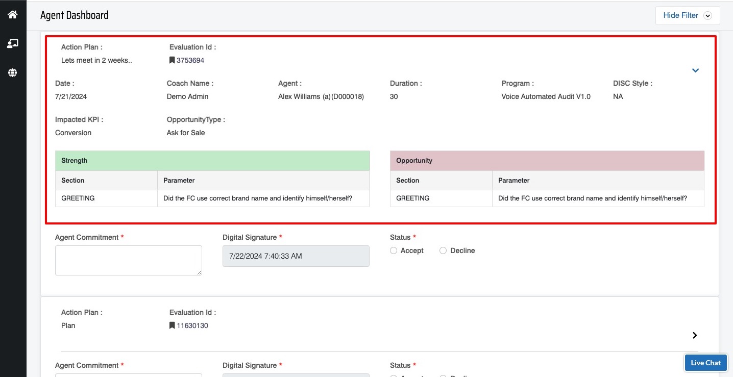 The Agent Coaching Dashboard functionality allows an agent to review evaluations and coaching’s assigned by their supervisor. This feature provides the customisable date range filters, program selection options, trend analysis tools, delivering rapid insights into performance metrics to support strategic decision-making. Agents can easily identify areas for improvement across various programs, monitor the progress with daily or weekly QA scores, and access modules directly. This promotes self-improvement and significantly enhance overall performance.