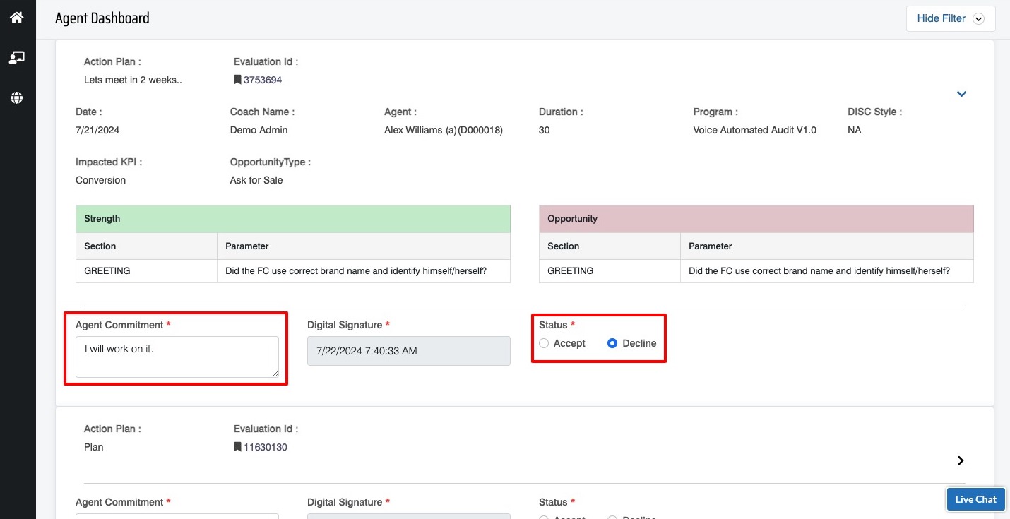Based on the coaching feedback shared for the specific program, the agent needs to enter the comments in the Agent Commitment text-box and select the Agent Status by clicking on either Accept or Decline radio button.