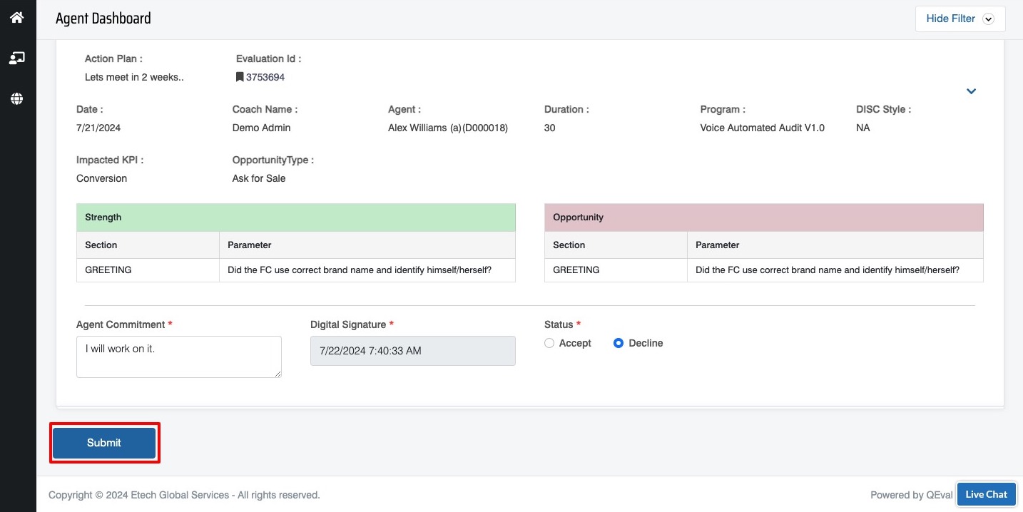 Once all the coaching feedback for specific program is entered by the logged-in agent, click on the Submit button to close the open coaching feedback.