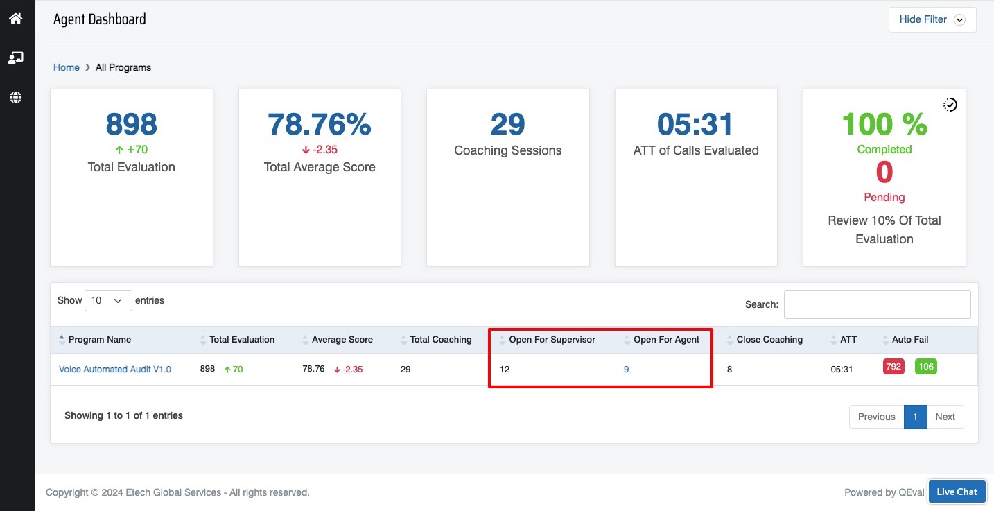 Once the coaching feedback is submitted by the agent, that coaching details will be sent to the supervisor and on the Agent Dashboard page the Open for Agent and Open for Supervisor details will be updated and displayed in the table grid.