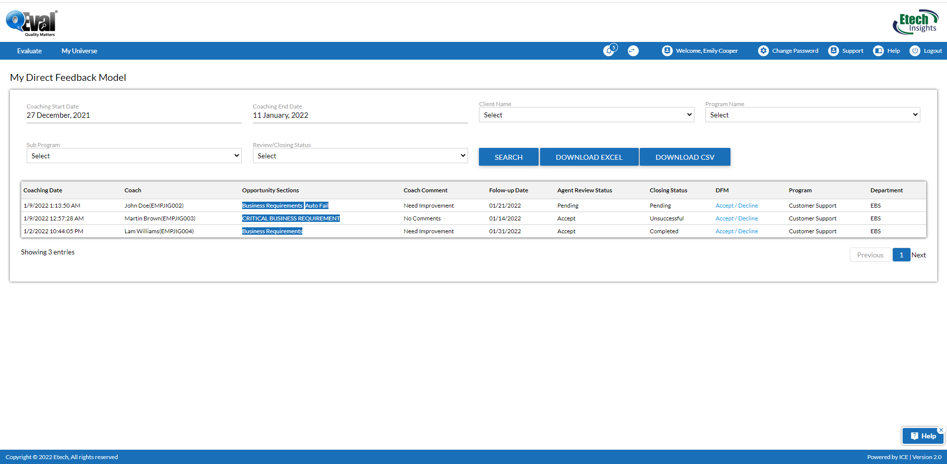 - Status- After analyzing the evaluation through View button option, a coachee can either click on Review radio button to accept the evaluation or can click on Decline radio button to decline the evaluation made for him/her.