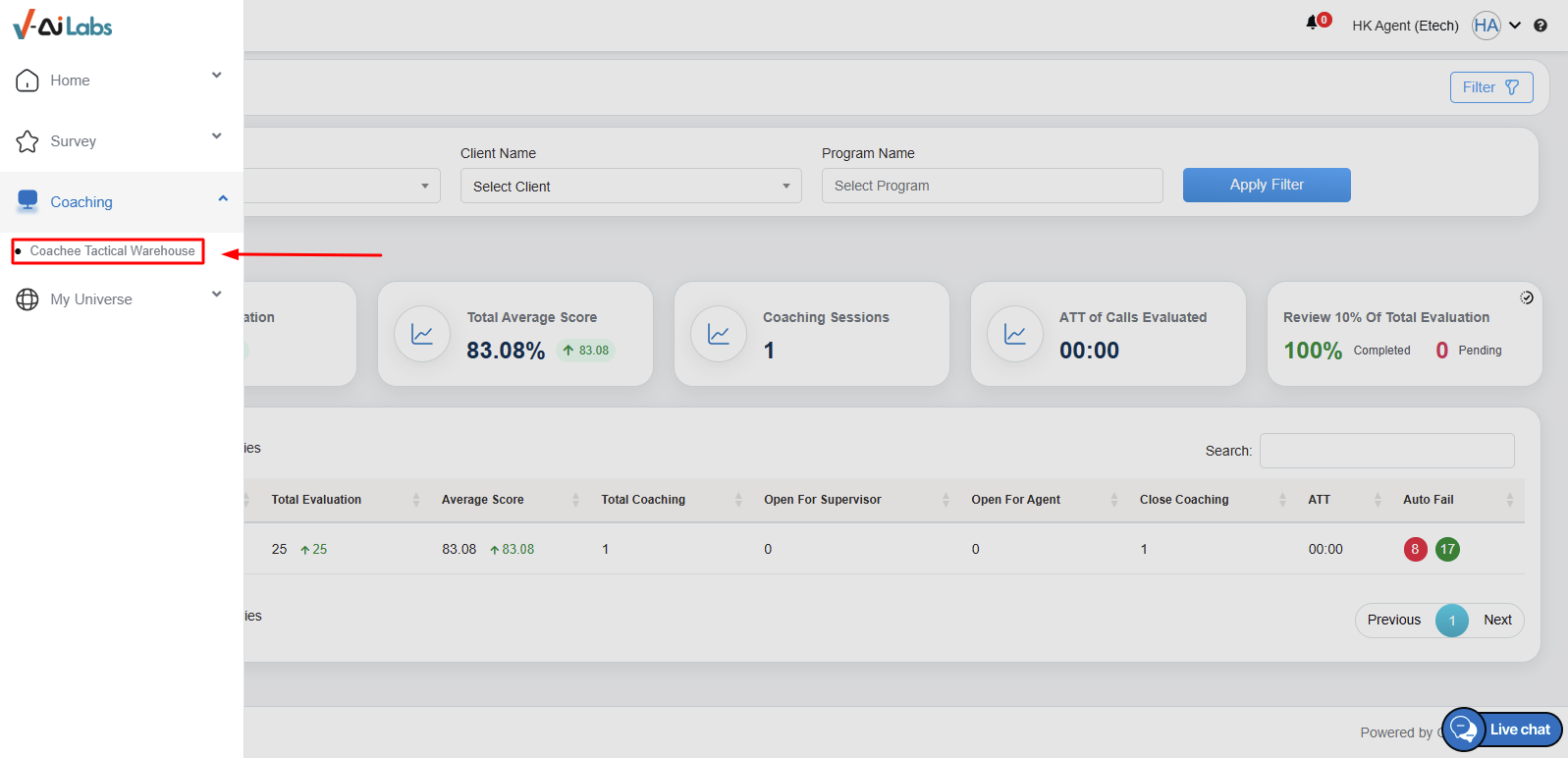 - Highlighted in the above screen is a View button along with the evaluation ID. Click the button and the system will redirects to the evaluation console. A coachee will be able to view the evaluation made by QA for him/her. This functionality helps a coachee to analyze and accept or decline the evaluation.
