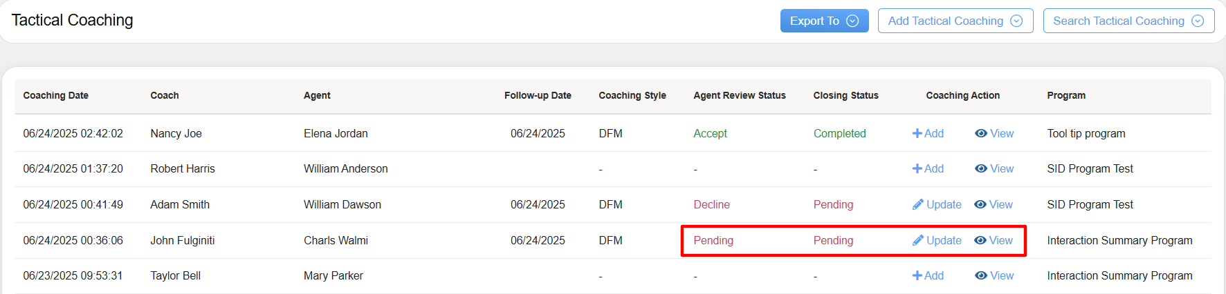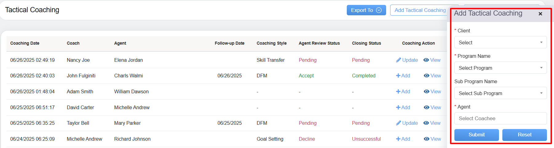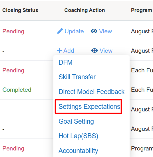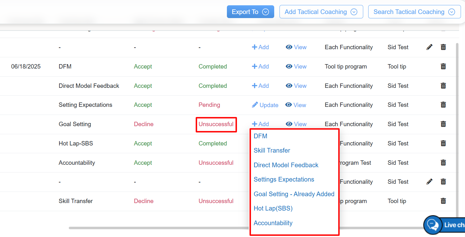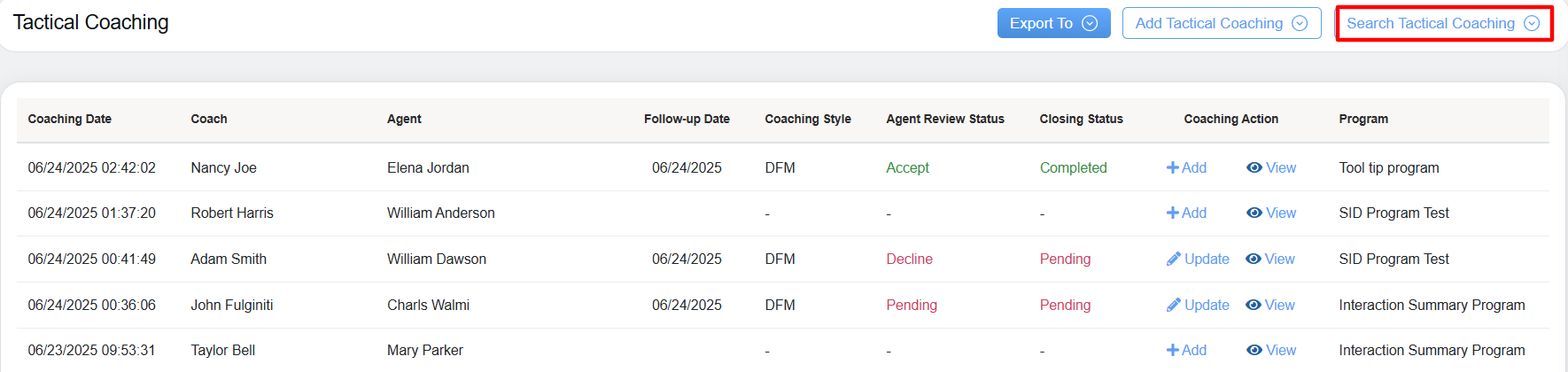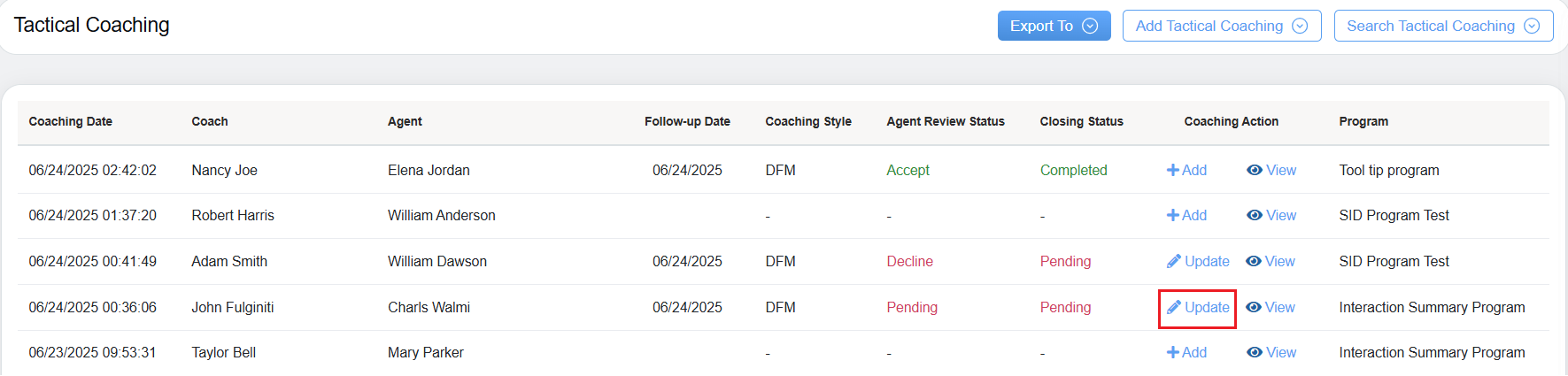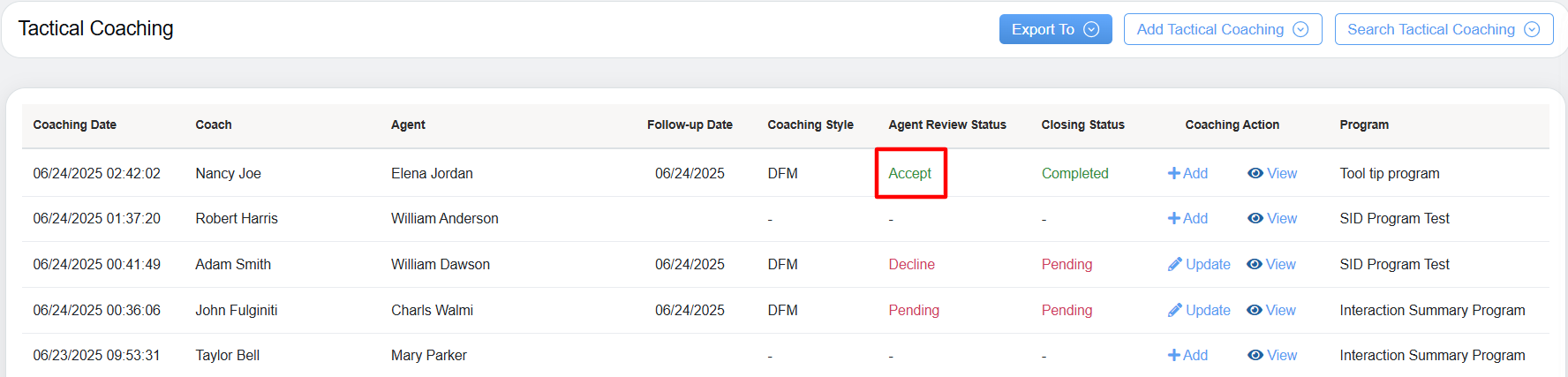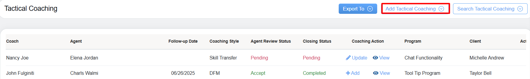 - Coaching Action: Allows coach to either Add or Update the specific coaching style and provides access to view the detailed coaching information.