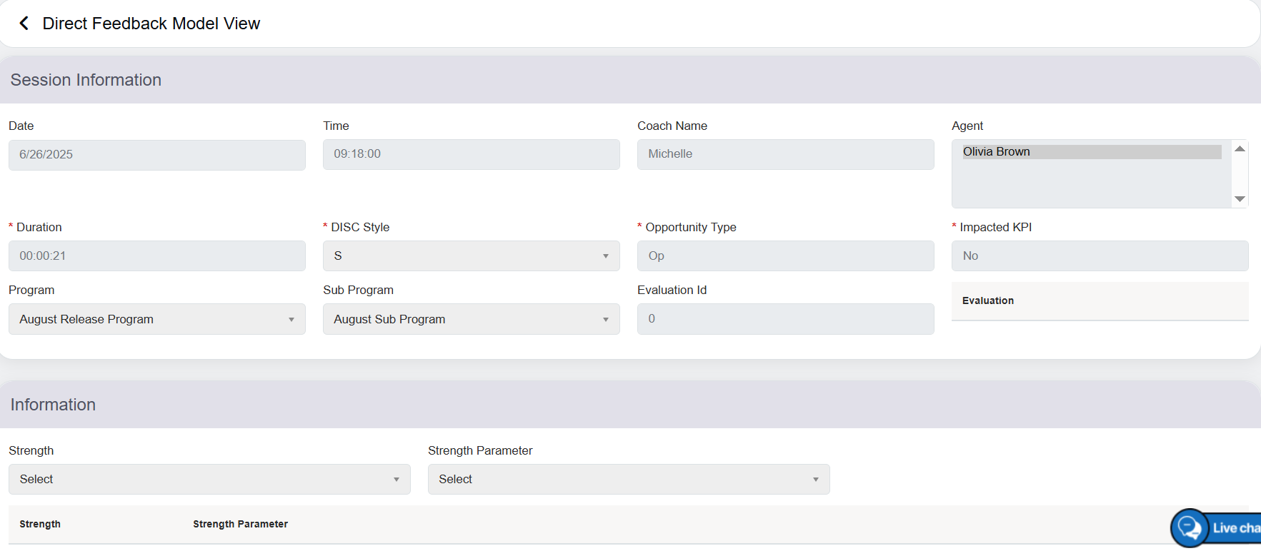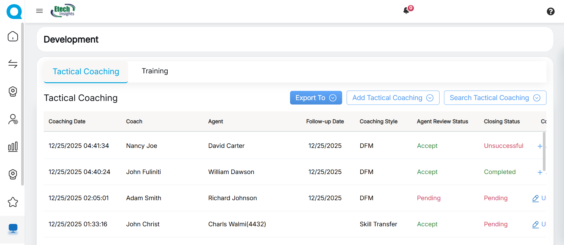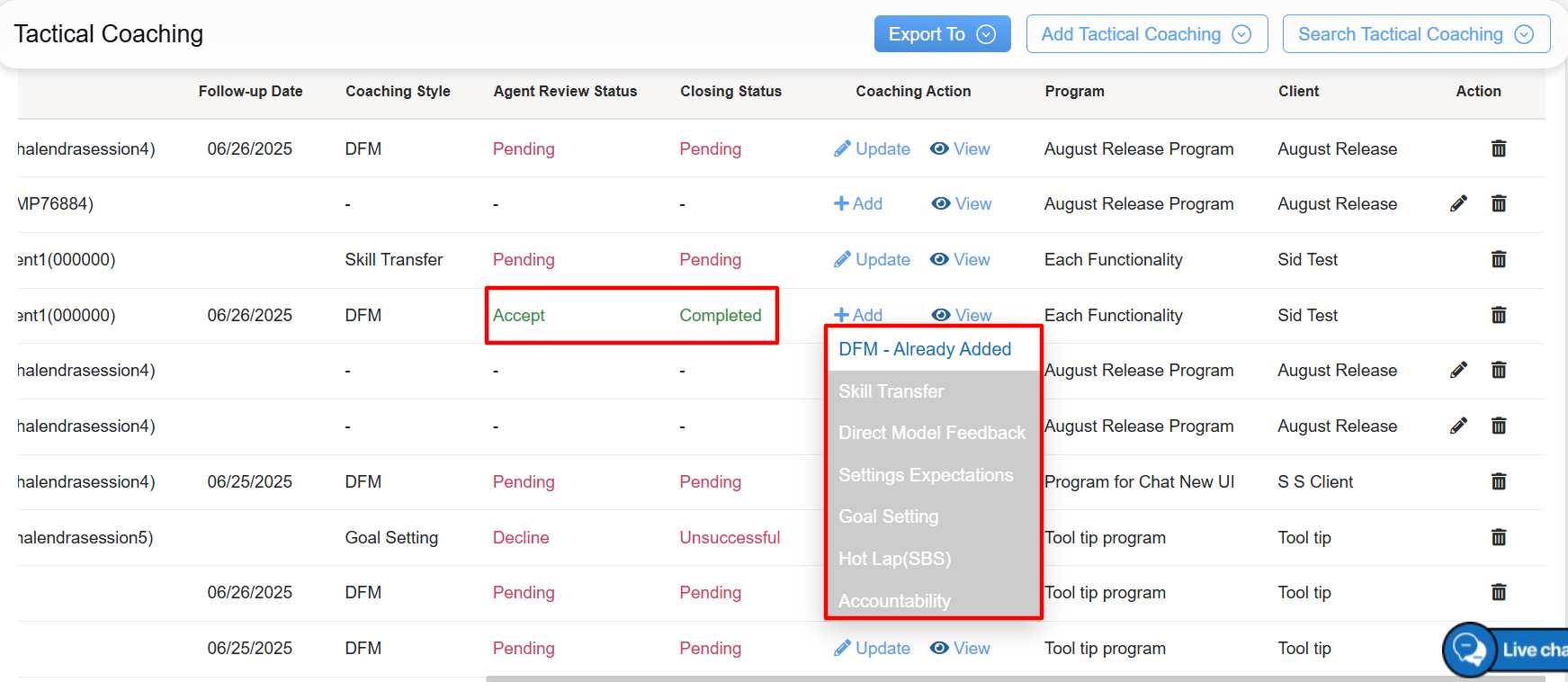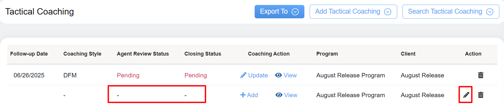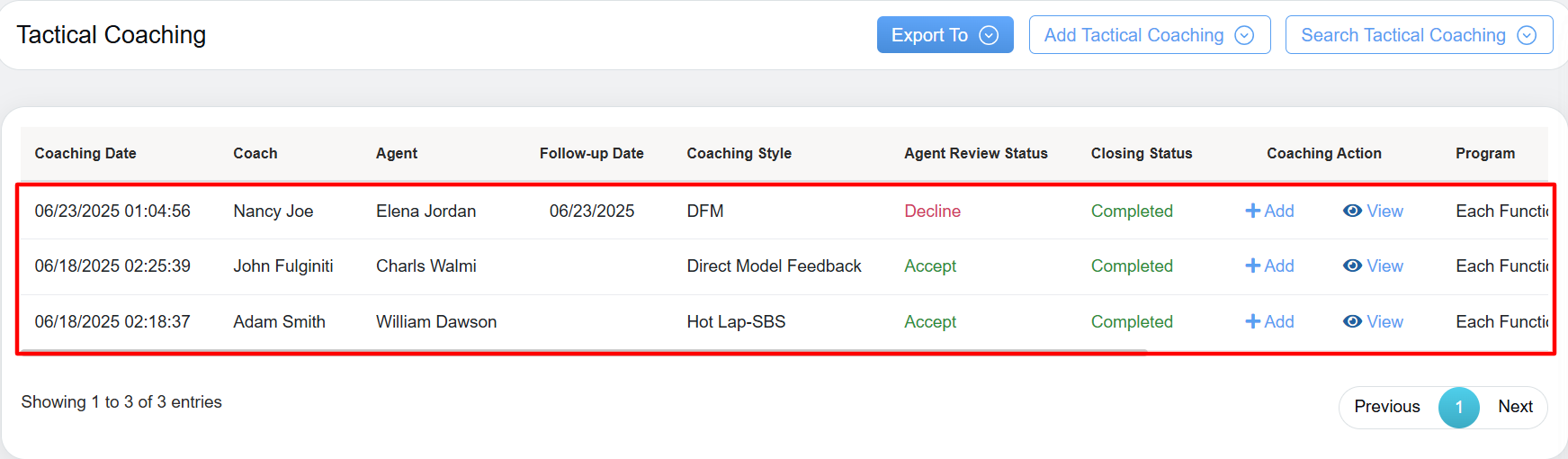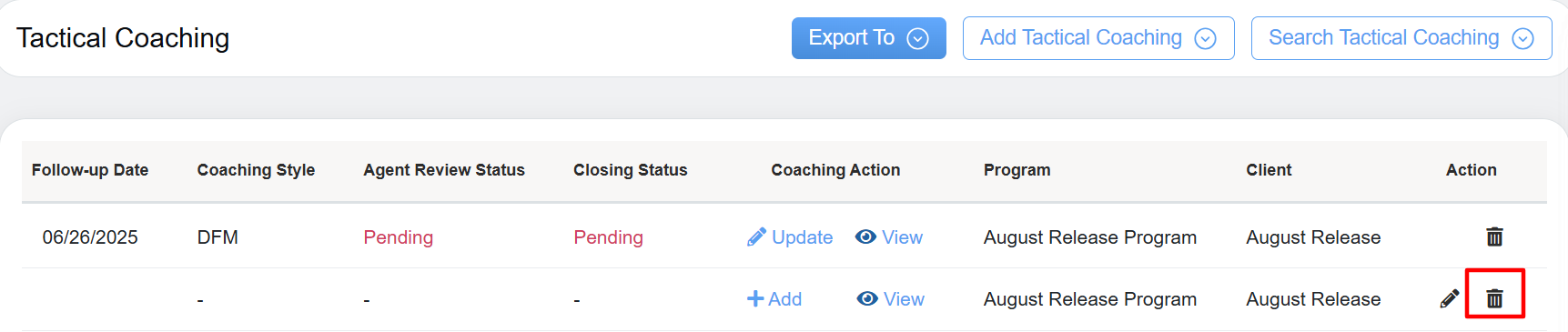 - Coaching Action: Allows coach to either Add or Update the specific coaching style and provides access to view the detailed coaching information.