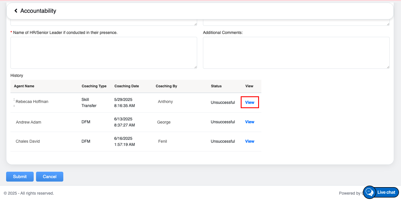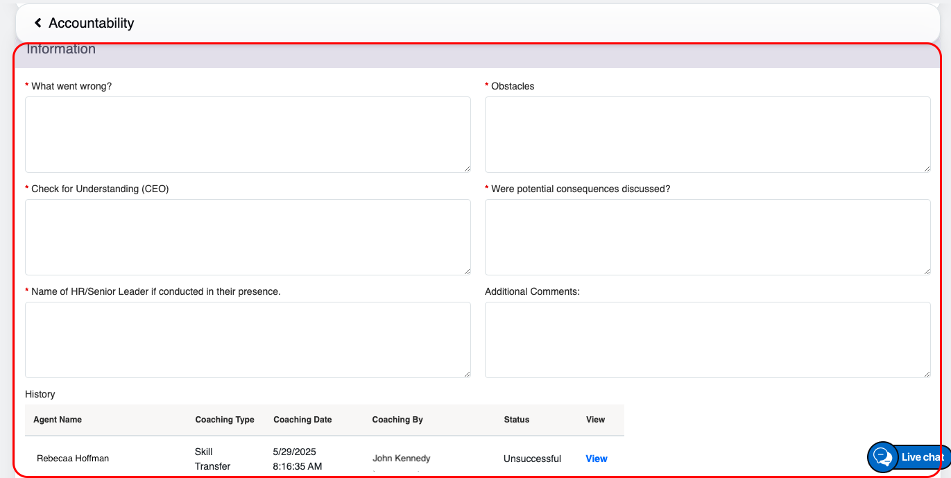 - The coaching actions that have been accepted by the agent and marked as “completed” cannot have further coaching actions added. These completed coaching actions will appear in a disabled state, clearly indicating that they are already recorded as shown in the screen below-