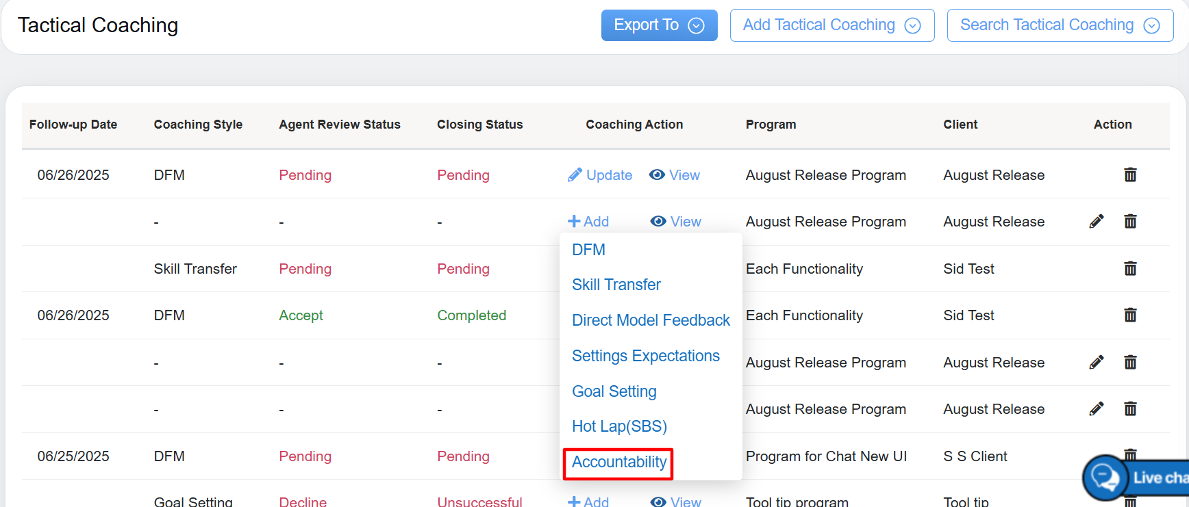 To Add a Accountability to coaching, from the Coaching Action page, click on the Accountability option from the drop down menu, displayed under the Add feature as shown on the following screen: