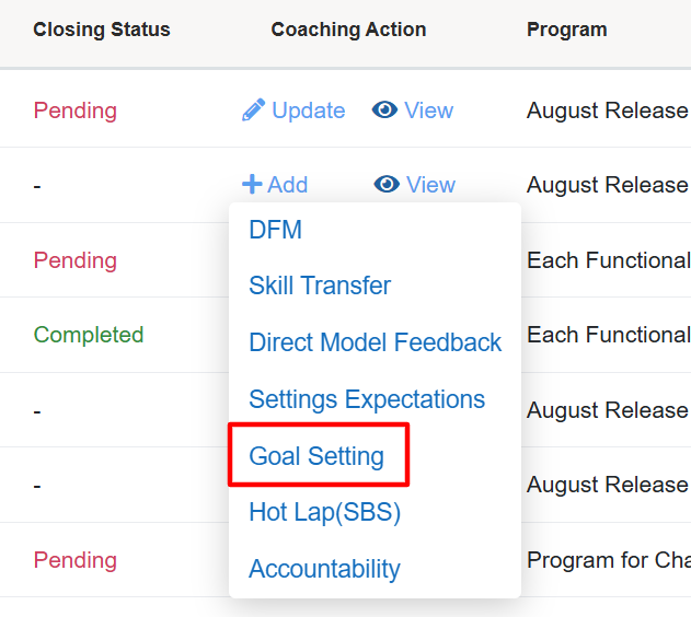 To Add a Goal Setting to coaching, from the Coaching Action page, click on the Goal Setting option from the drop down menu, displayed under the Add feature as shown on the following screen: