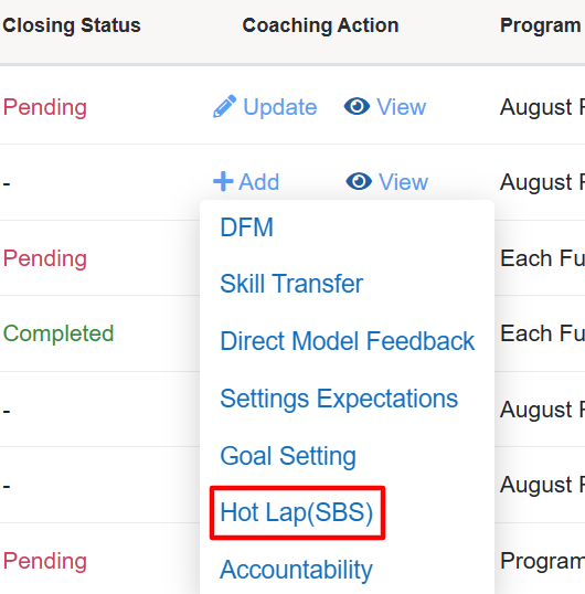 To Add a Hot Lap- SBS to coaching, from the Coaching Action page, click on the Hot Lap- SBS option from the drop down menu, displayed under the Add feature as shown on the following screen:
