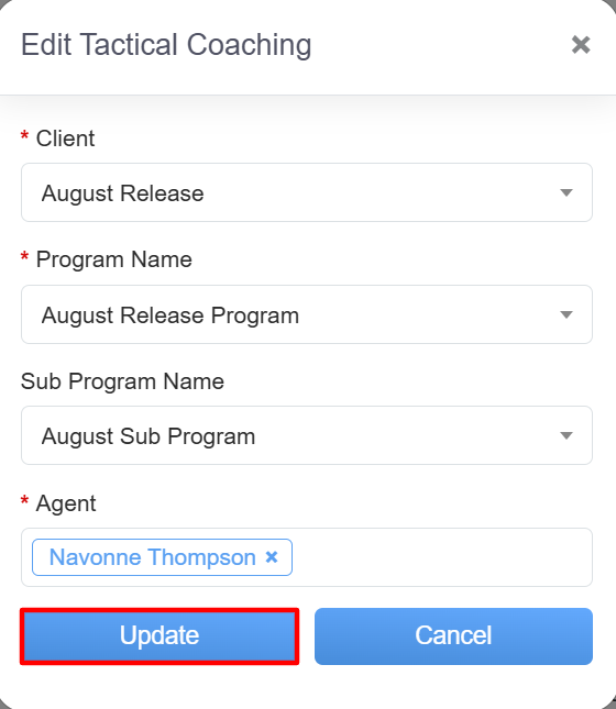 A pop-up window for editing the selected coaching tactical will appear. The user can modify the displayed fields and click the “Update” button to save the changes to the coaching details.