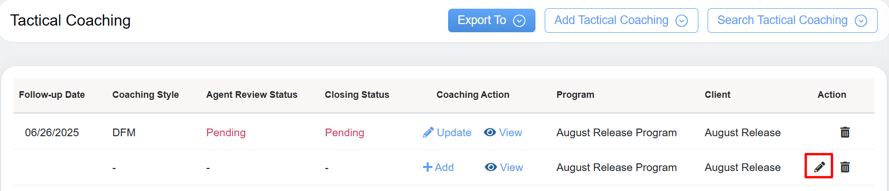 The configured Tactical Coaching can also be edited from the grid located on the Tactical Coaching page, within the Action column, as shown below.