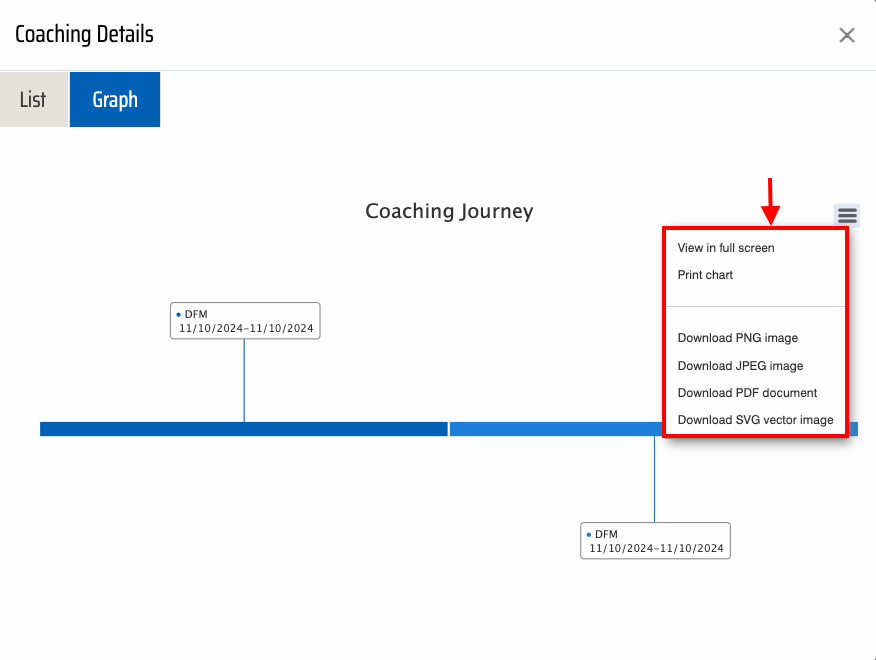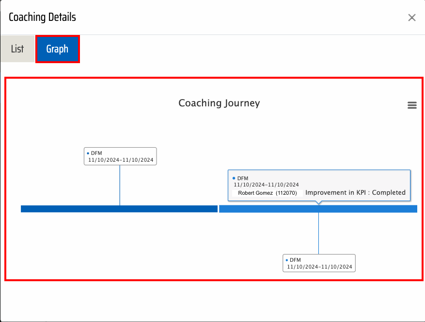To view the step-by-step graph of the selected coaching journey, click on the Graph option. Upon clicking, a detailed graphical representation of the user’s coaching journey will be displayed, offering a comprehensive overview of their progress and performance-