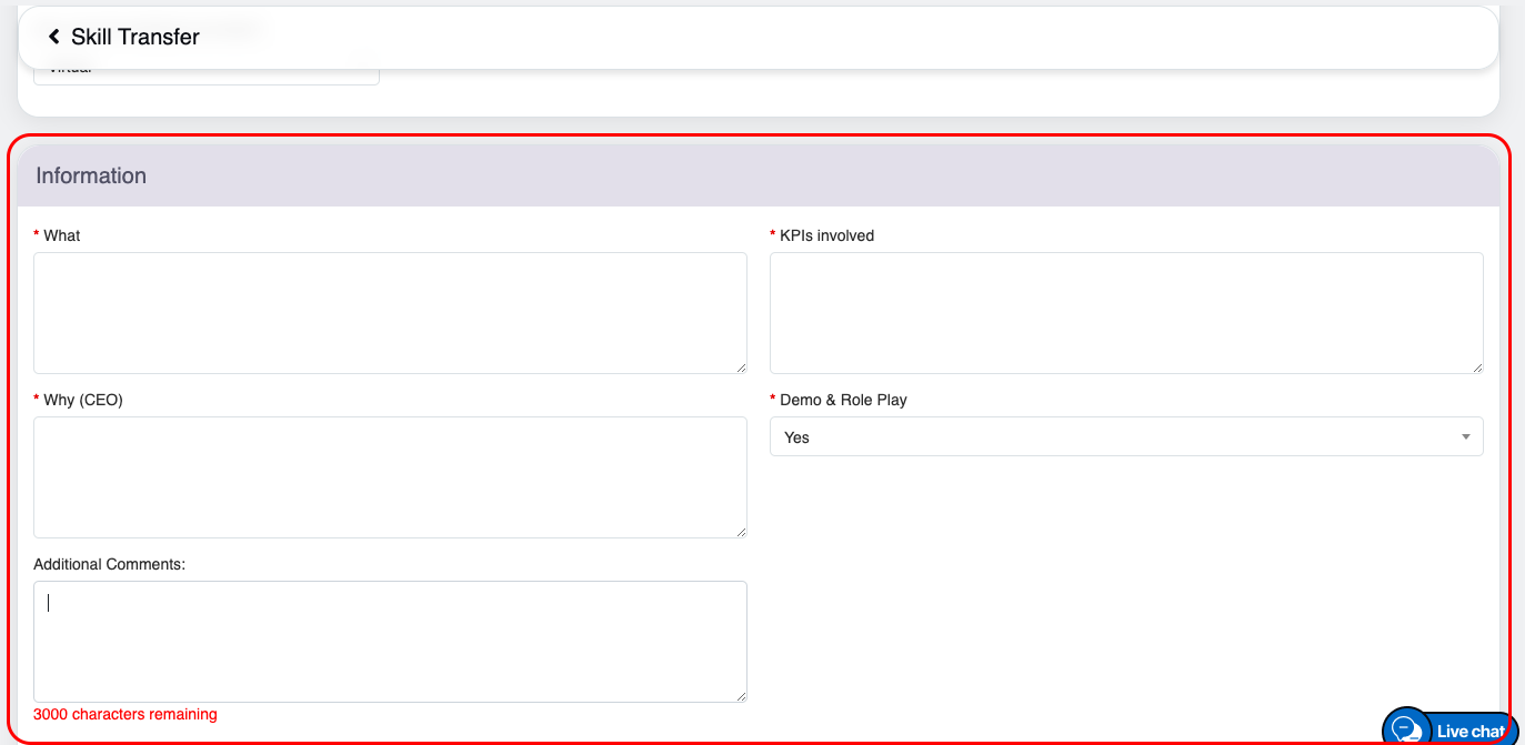 Specify the skills to be transferred to coachee, including evaluation techniques and feedback methods. The text box allows 2,000 characters and displays a live word count while typing. |