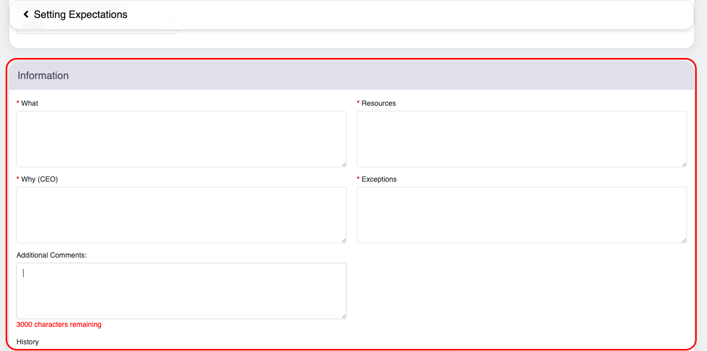 | Check for Understanding (CEO) | Enter confirmation that the coachee understands the feedback and expectations. The text box allows up to 2,000 characters. A real-time word count is displayed as you type. |