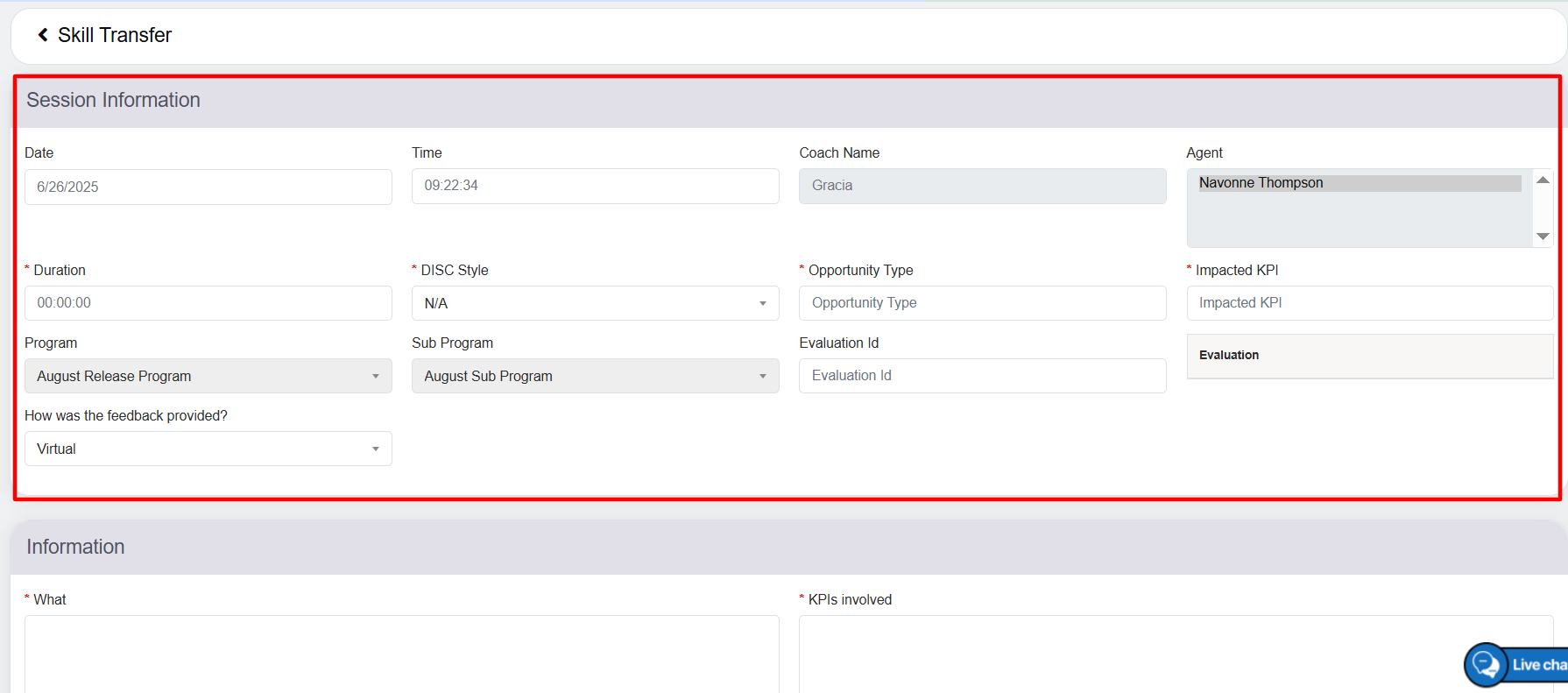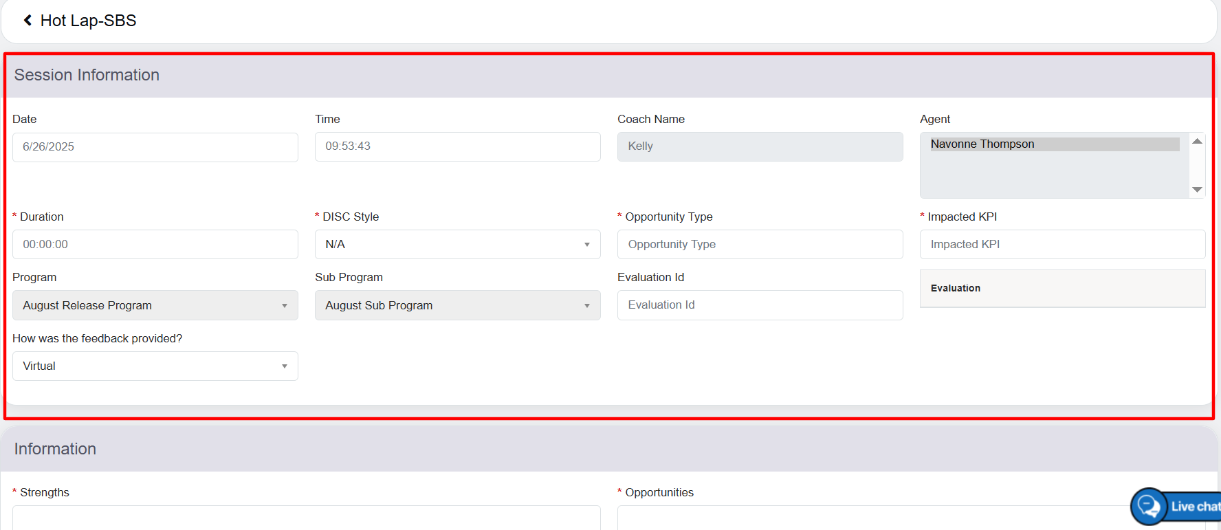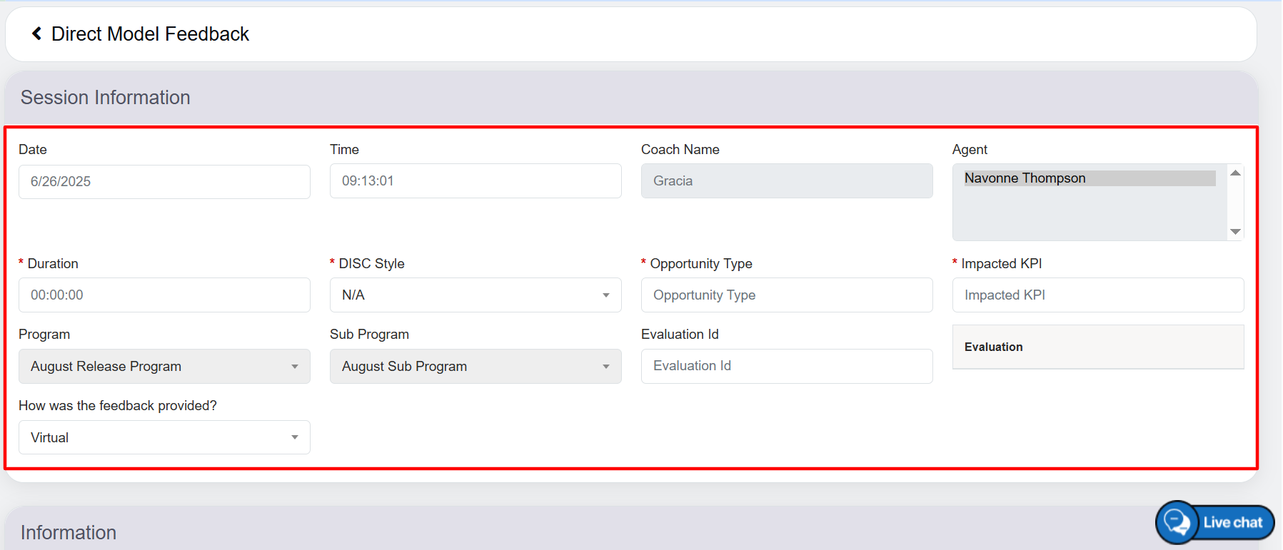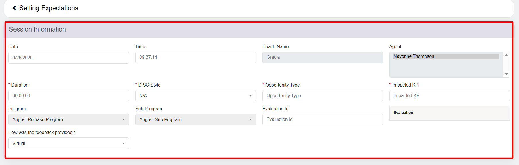 Displays the name of the agent for whom the coach is providing the feedback. |