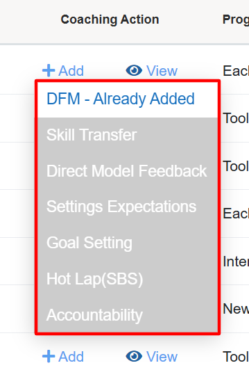 To Add a DFM to coaching, from the Coaching Action page, click on the DFM option from the drop down menu, displayed under the Add feature as shown on the following screen: