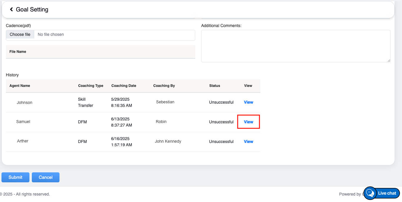 5. The system permits coach to select a maximum of 10 agents. Upon entering an agent’s initials, a dynamic dropdown menu will display relevant name suggestions to facilitate the selection process.