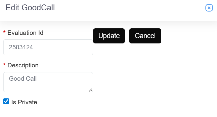 - Is Private: When this checkbox is selected by the Admin, the good call reference would be intended only for a particular agent and supervisor associated with the evaluation. When not selected, the call will be visible to every agent and supervisor.