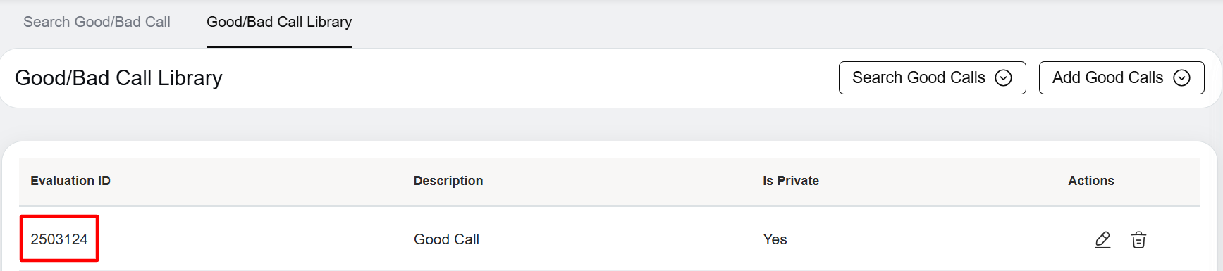 Click on the evaluation ID link displayed on the Good/Bad Call Library page.