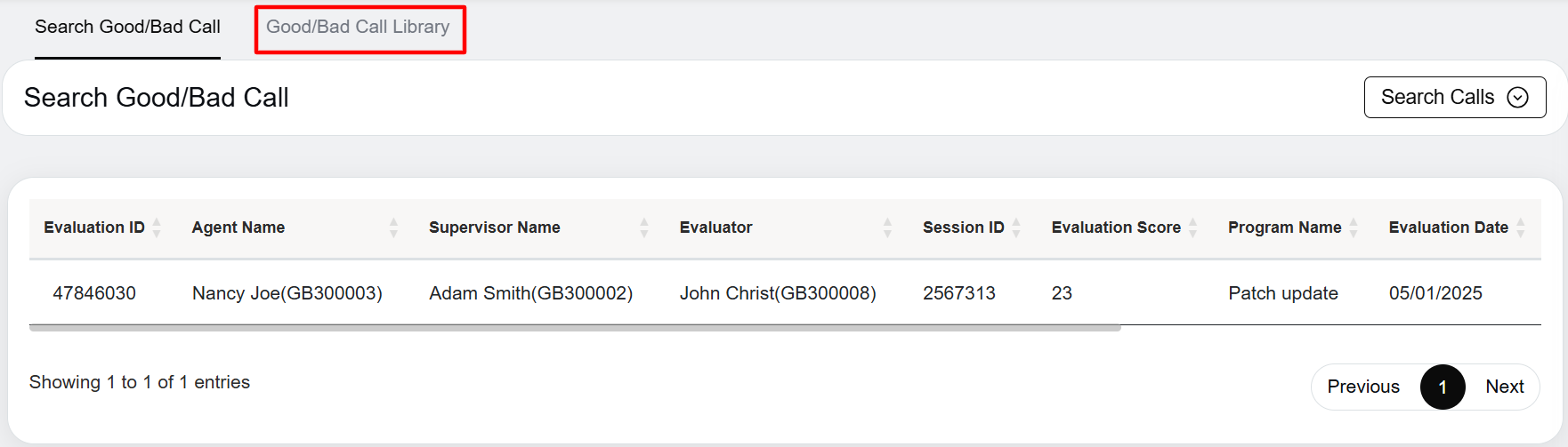 From this page, the agent/supervisor can also search for specific good calls from the library.
