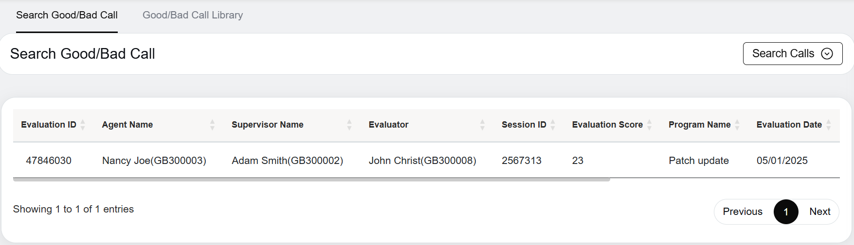 Once configured, click on the Search button, and based on the set filters, the list of good calls will be displayed. Then, the user can click on a particular Evaluation ID link to listen to the call record.