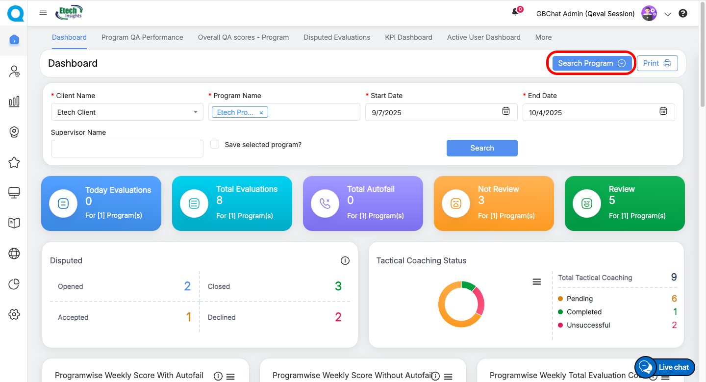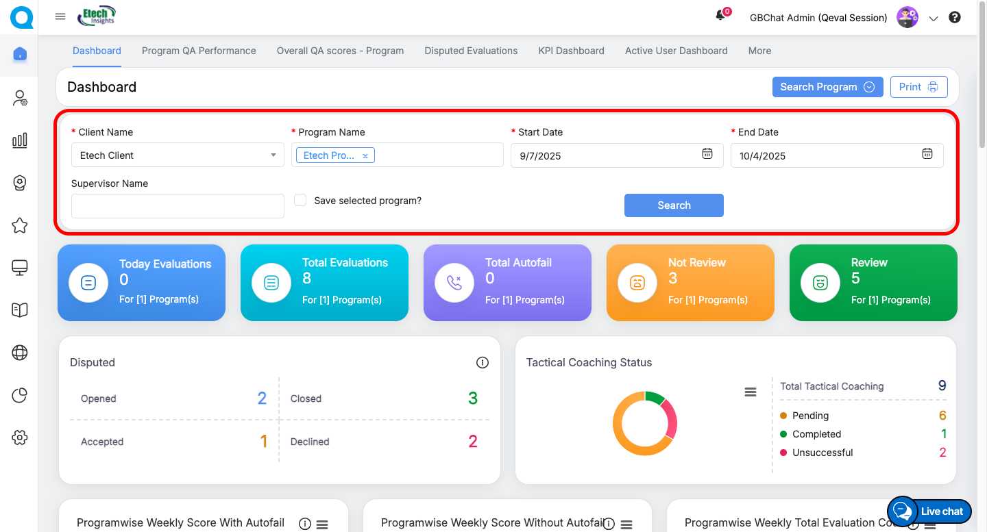 On the Program QA Performance page, the Admin would be able to view the weekly data for Voice Campaigns and Chat Campaigns.