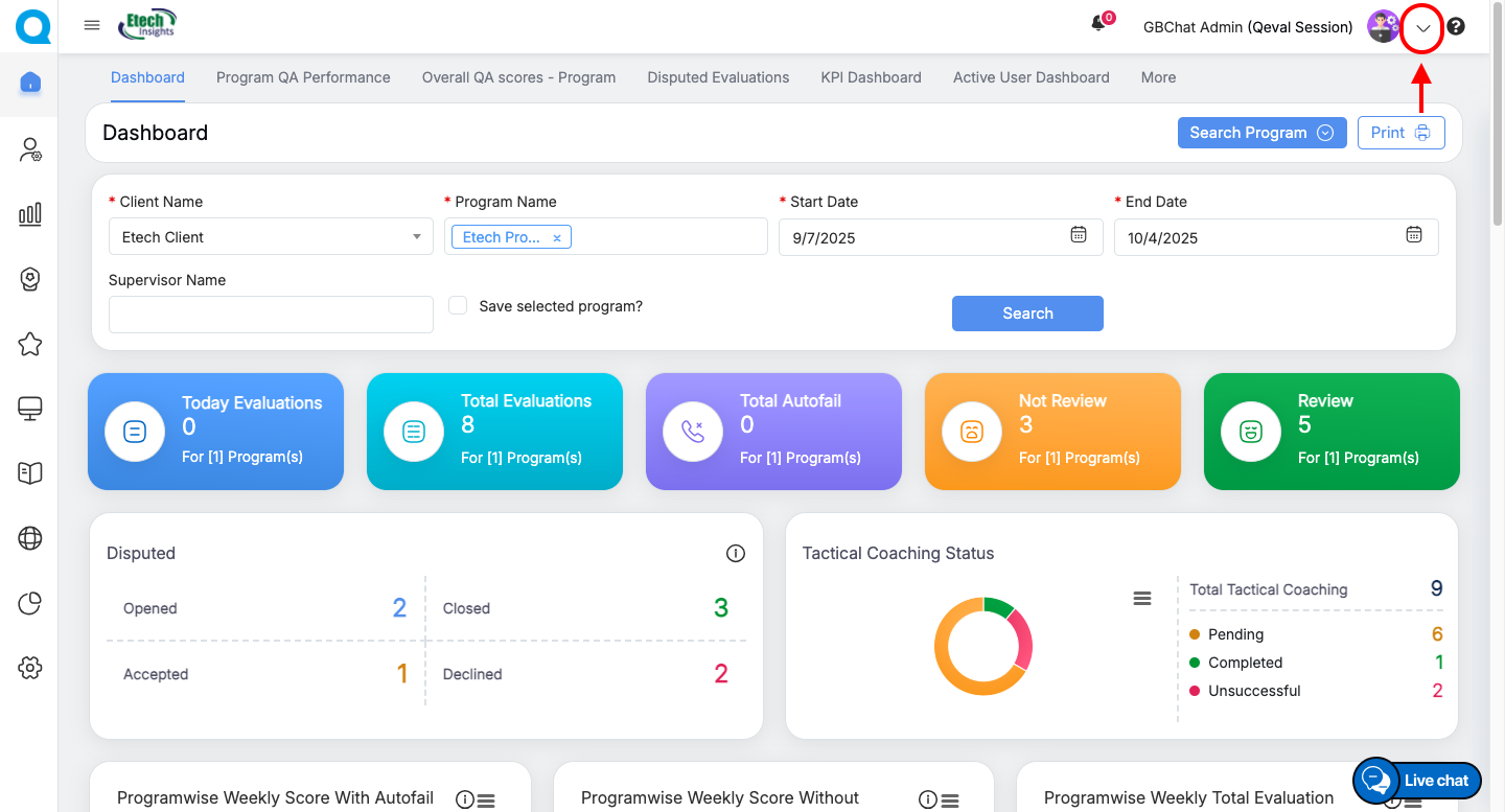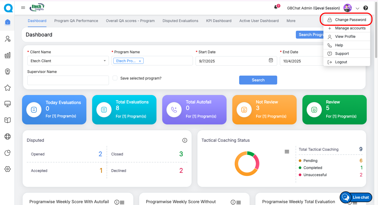 QEval allows users to change their passwords. Once the user logs into his/her account, click on the User Profile located at the top right corner of the screen.