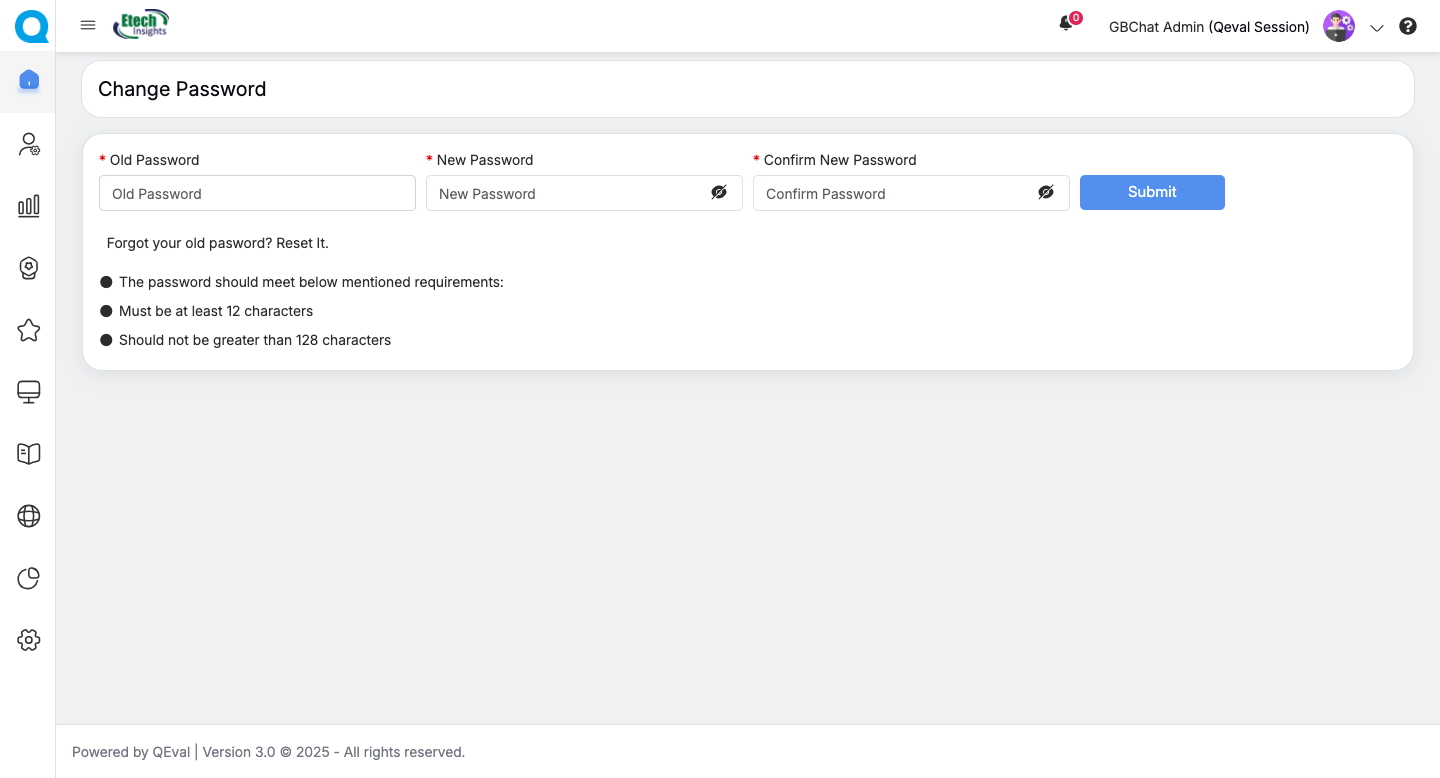Once the password is updated, log back into the QEval account using the updated credentials. If unable to log in, then click on the Forgot Password link displayed on the login page and do the required configurations.