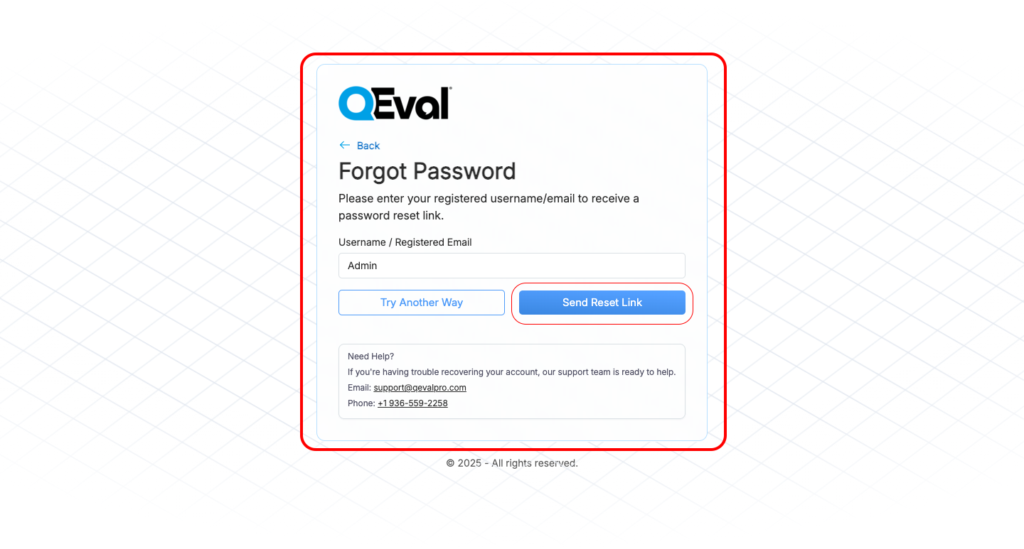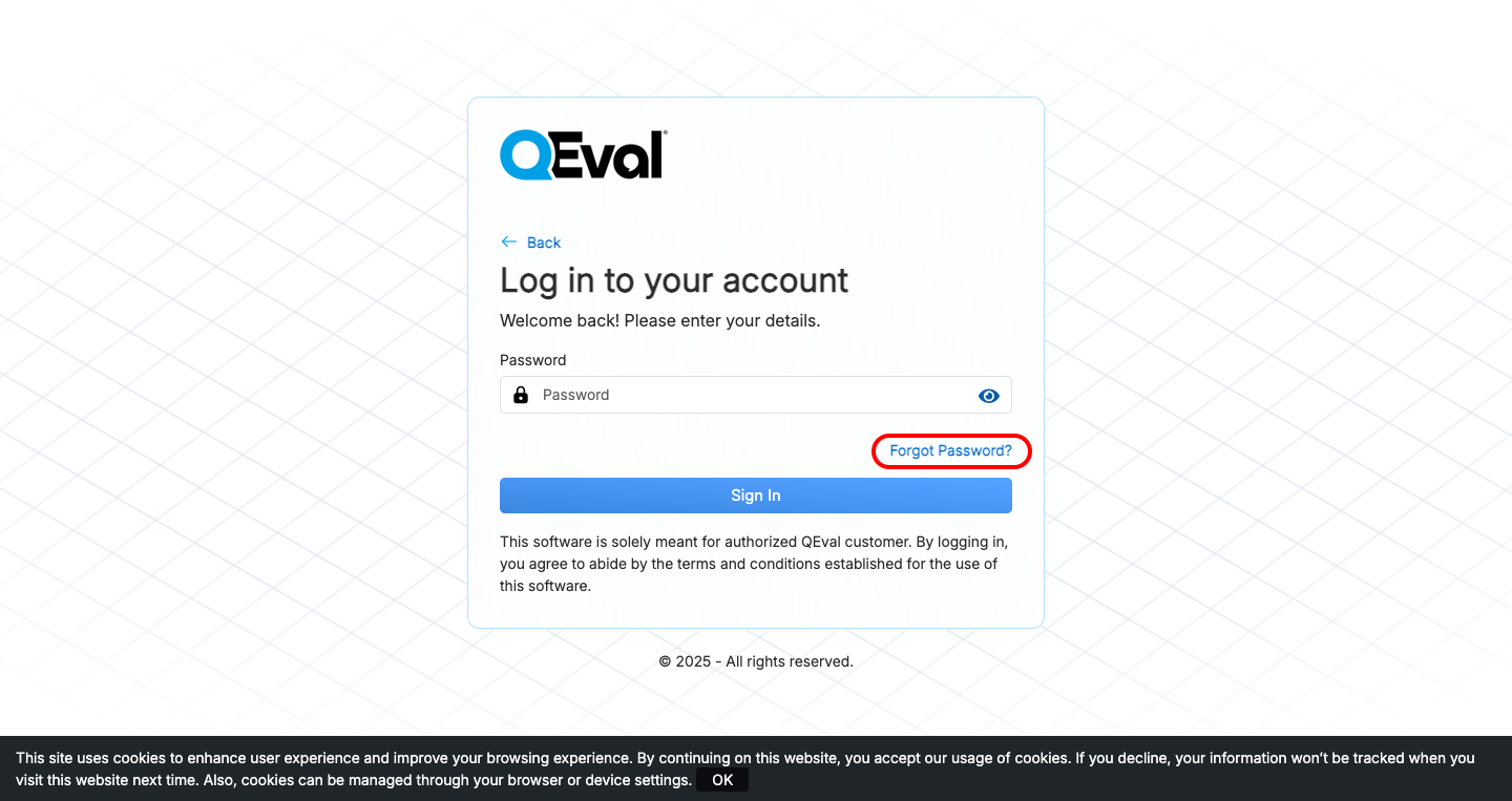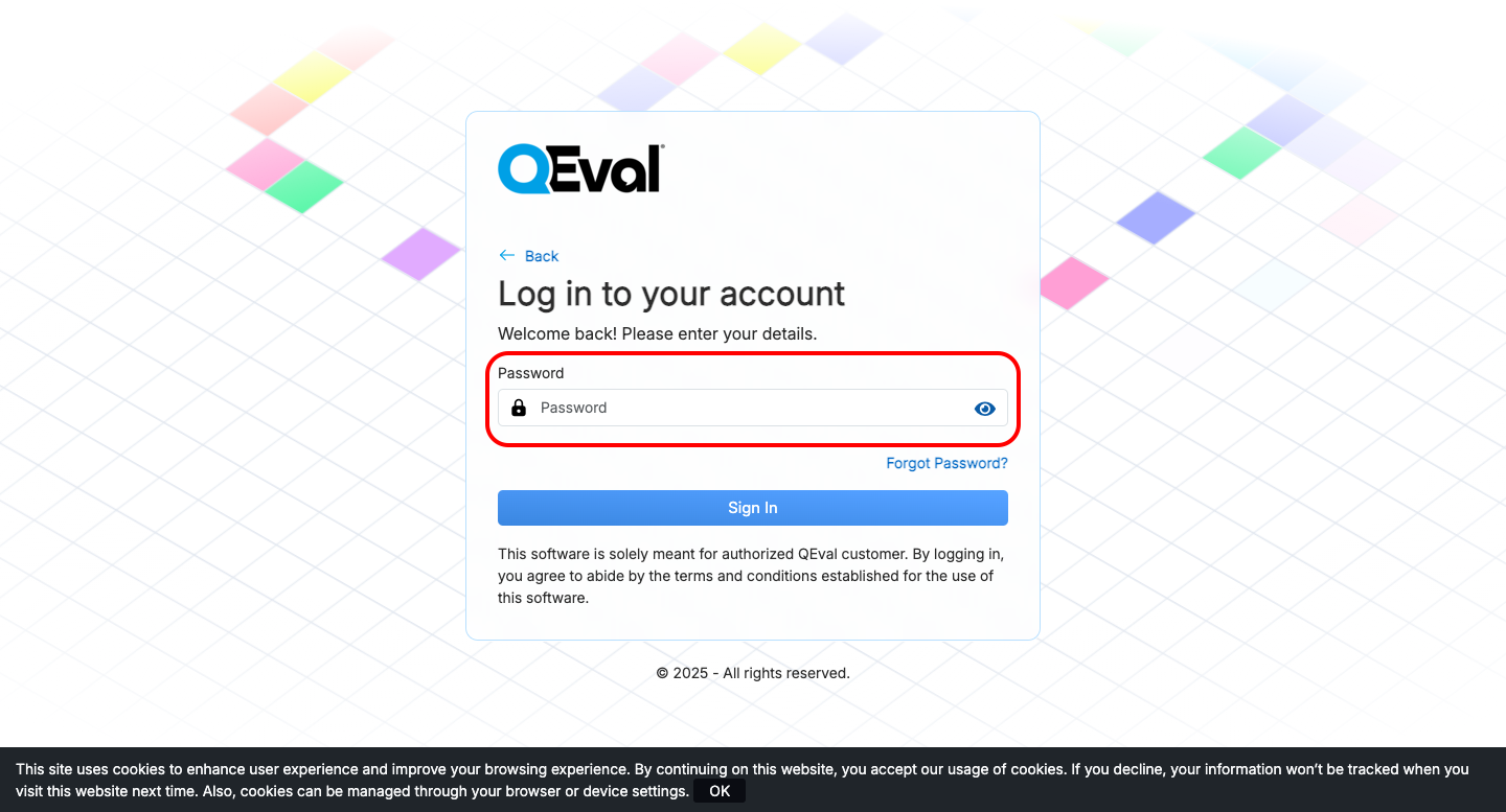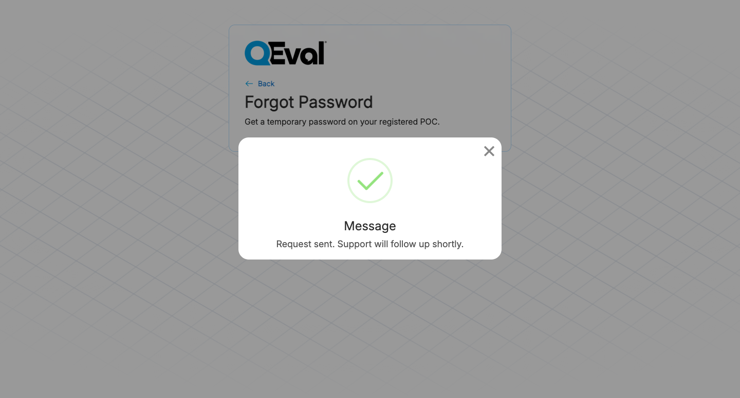 Once your new password is successfully created, you can log in again to access your QEval Dashboard.
