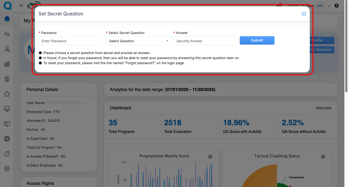 - Navigate to My Profile → Set Security Question.