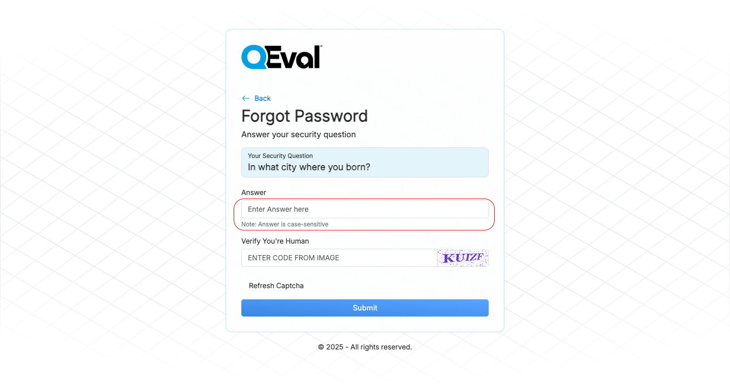 Below your Security Question, Enter the correct answer in the provided field, complete the CAPTCHA, and click Submit.