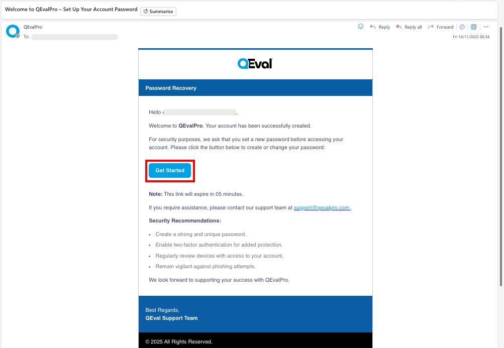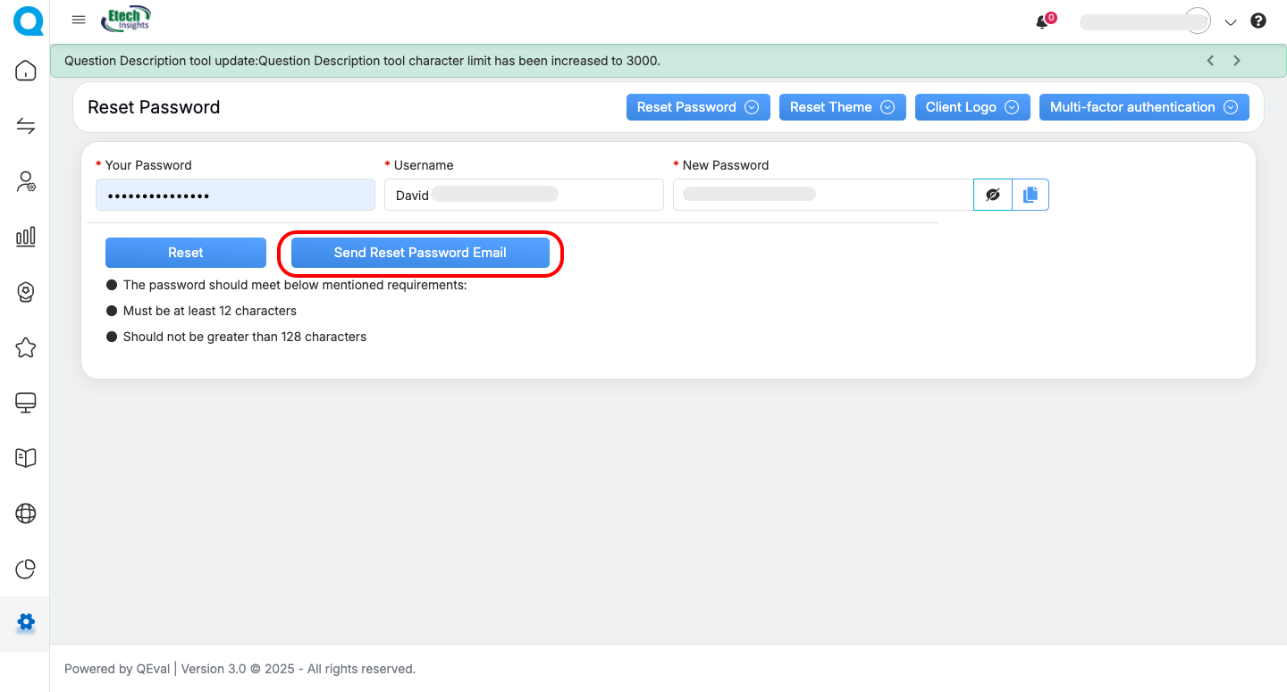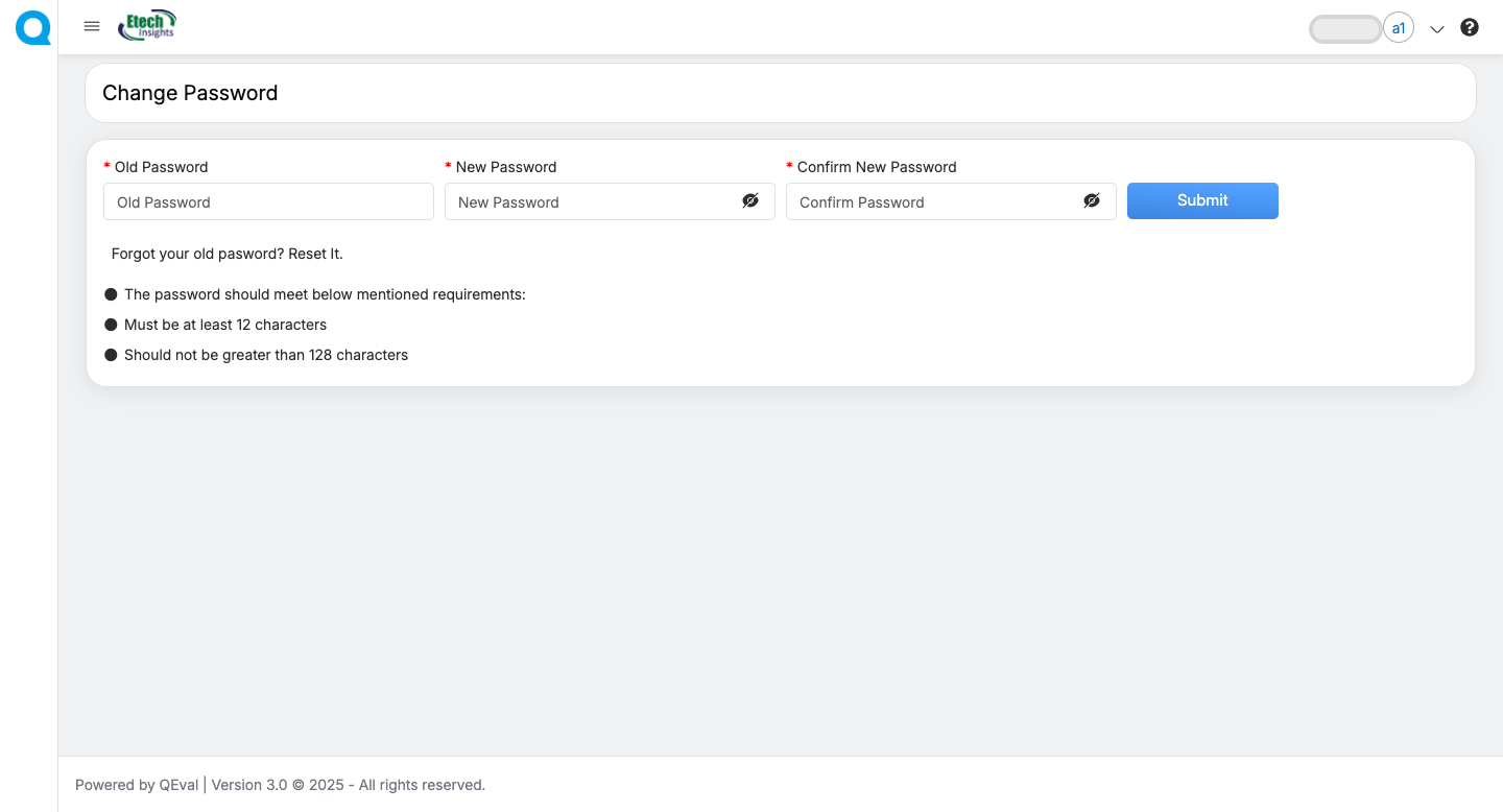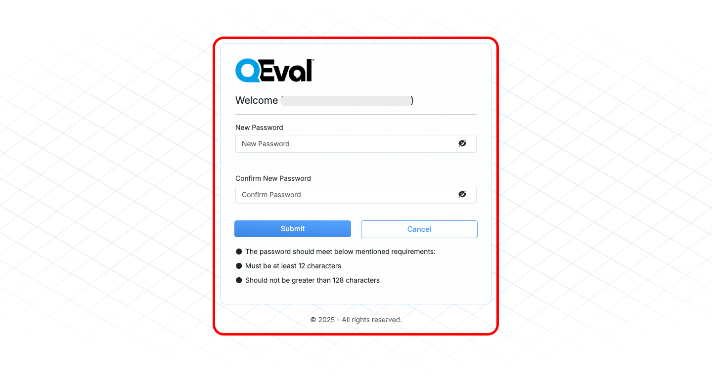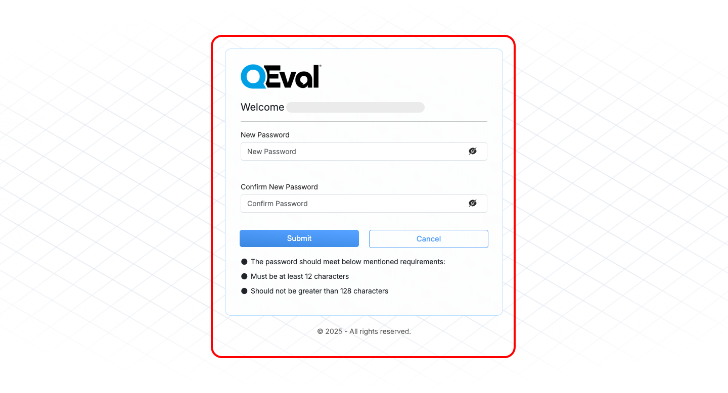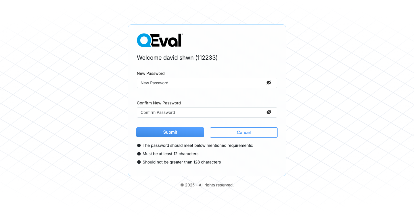 Passwords must meet QEval’s minimum security criteria.