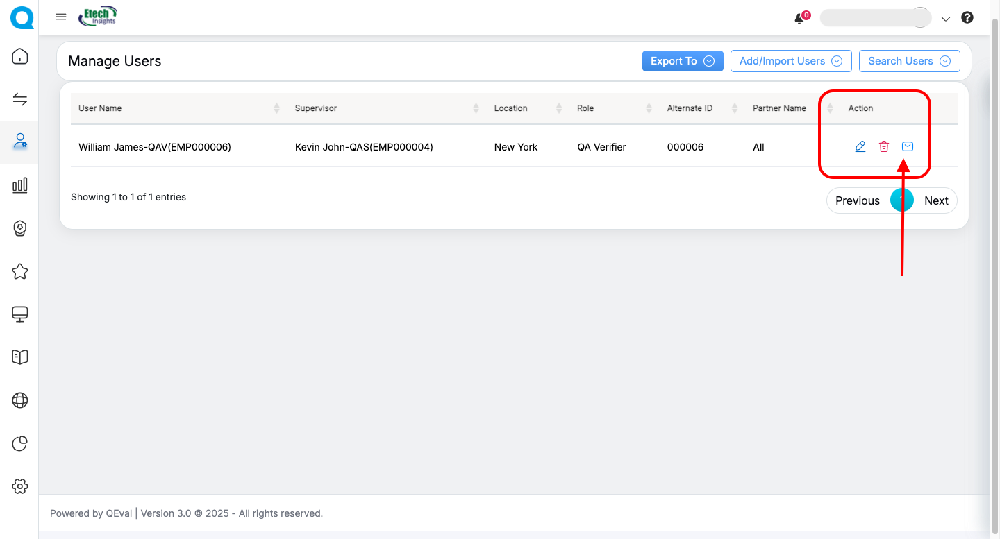 In the Action column next to the user, you will find three options — Edit User, Delete User, and a Email icon.