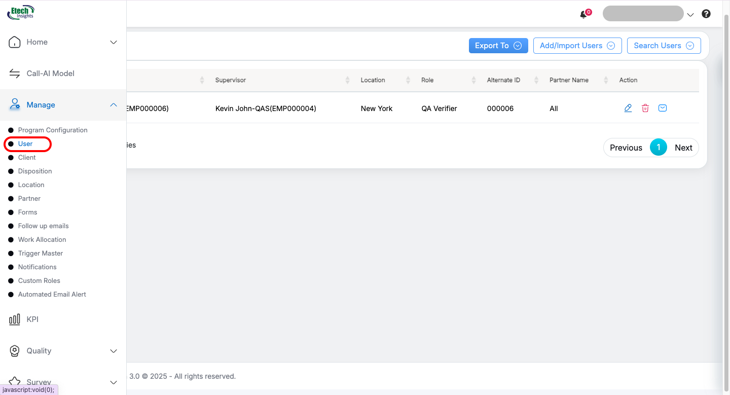 1. After logging in, the Admin should navigate to the Manage Users section.