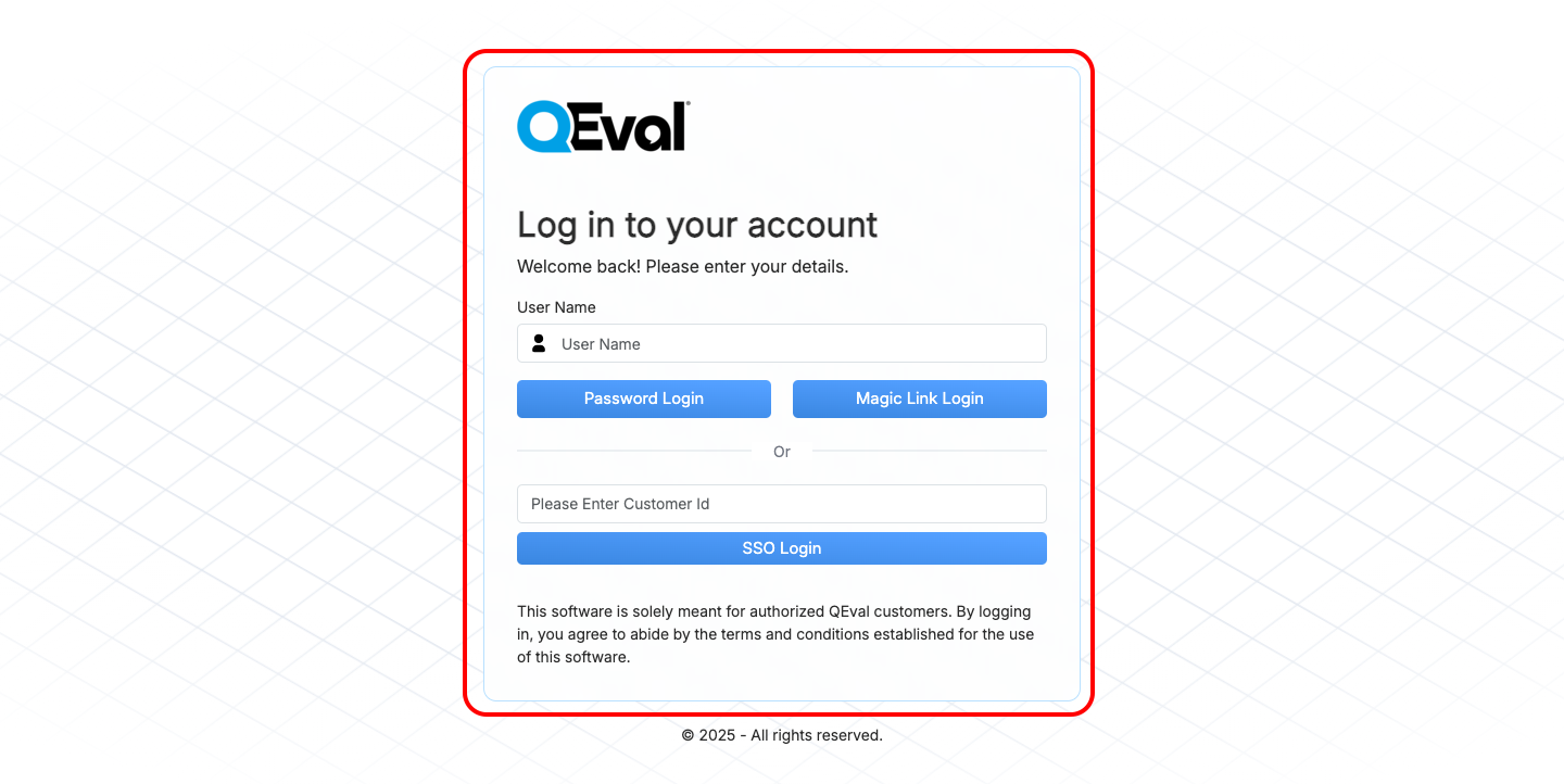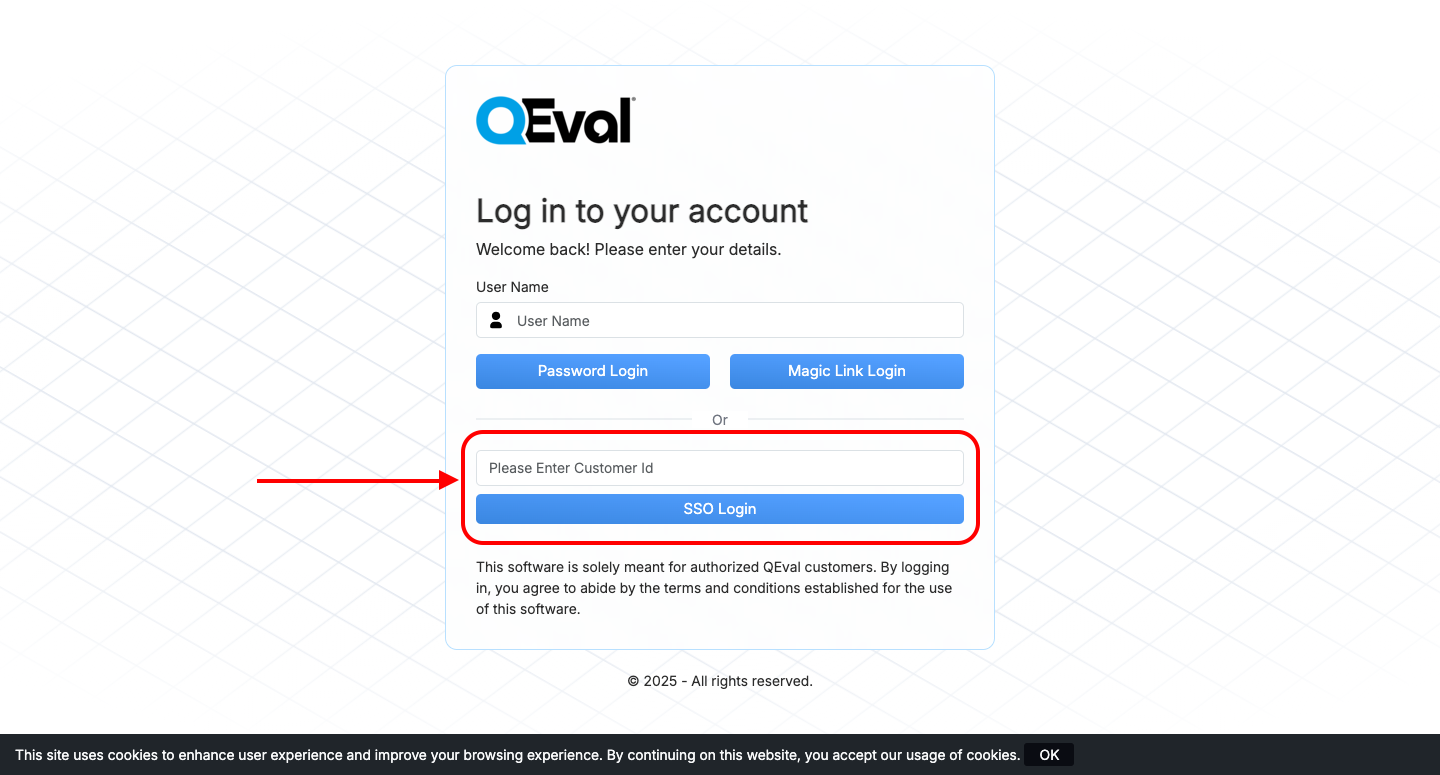Users can securely log in and seamlessly access the QEval portal using the Single Sign-On (SSO) option. The QEval Support Team configures and provides a Customer ID to each user based on the client’s requirements.