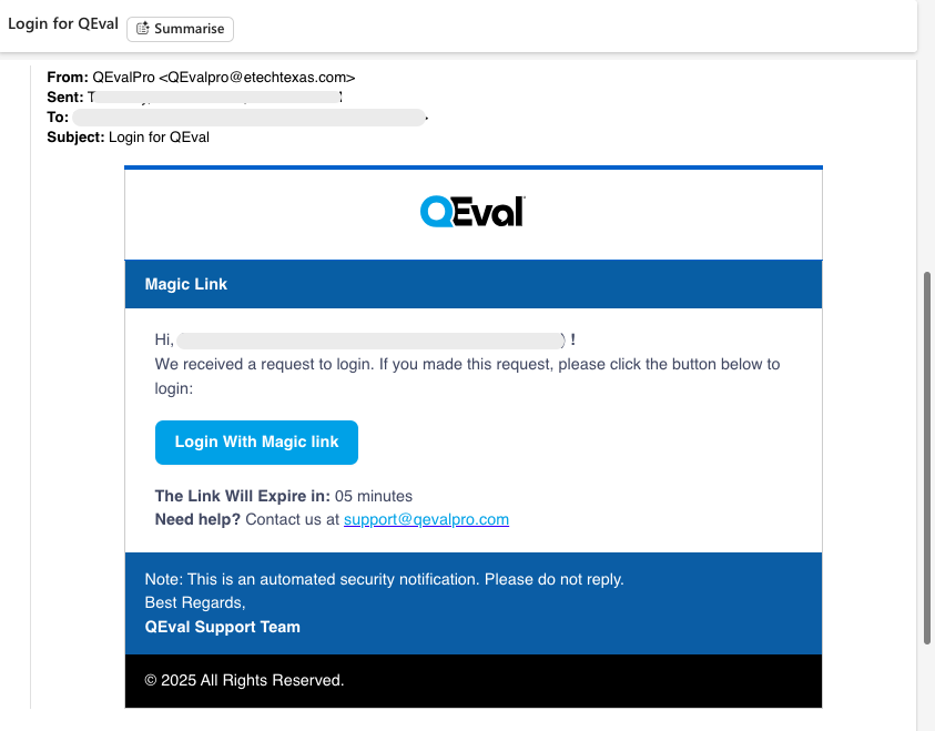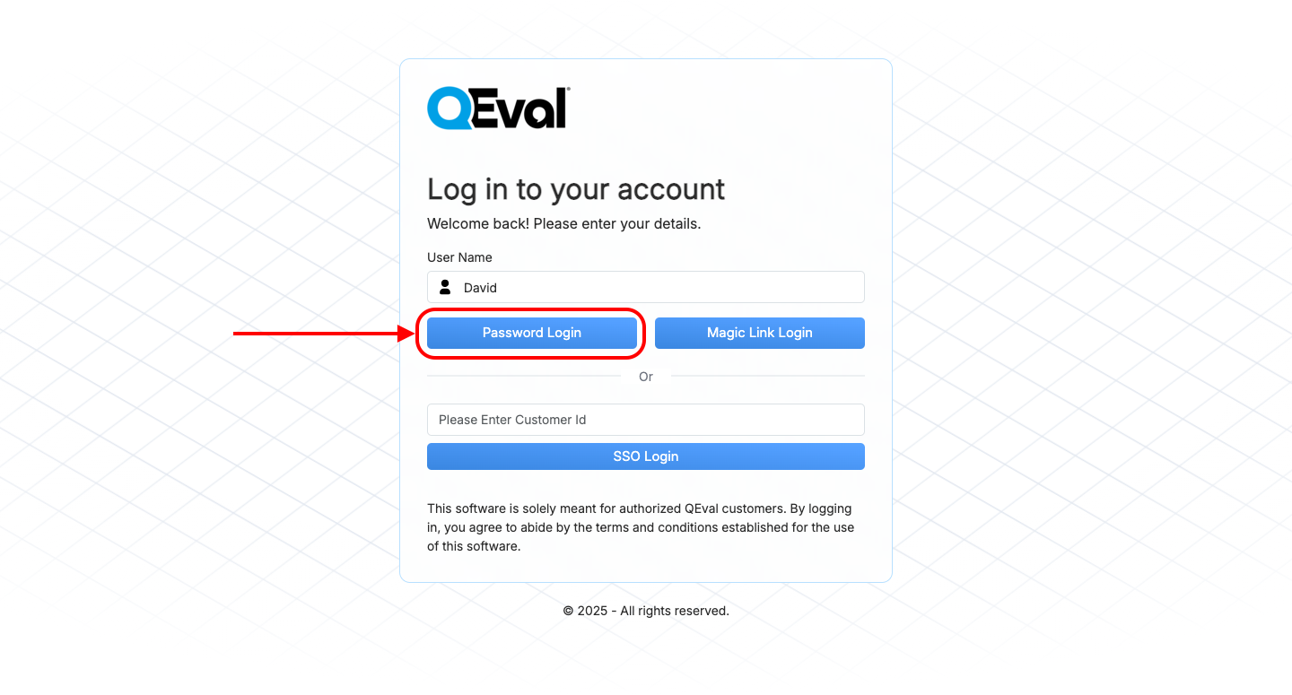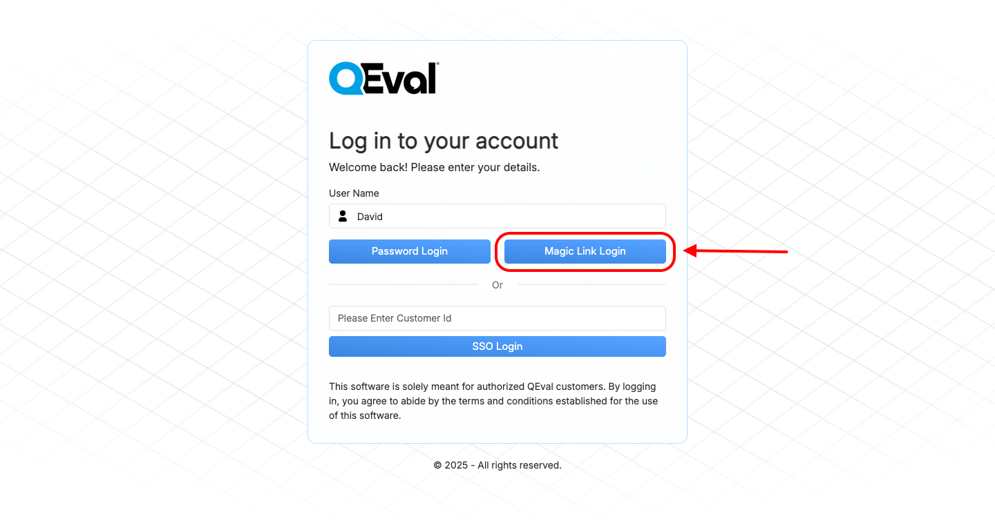 Login using QEval account credentials — either User ID and Password or Magic Link.