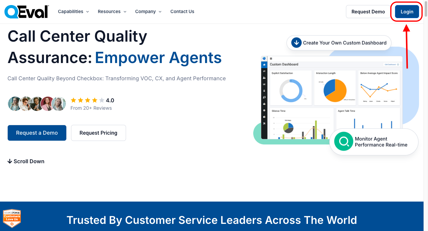 After opening your assigned URL (for example, https://www.qevalpro.com), click the Login button as displayed on the screen above.