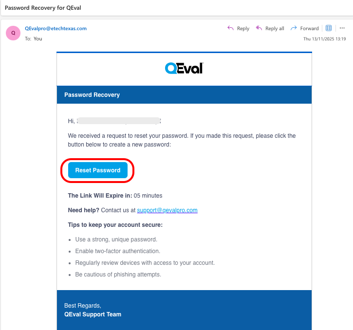- The user will receive the reset link via email as shown below.