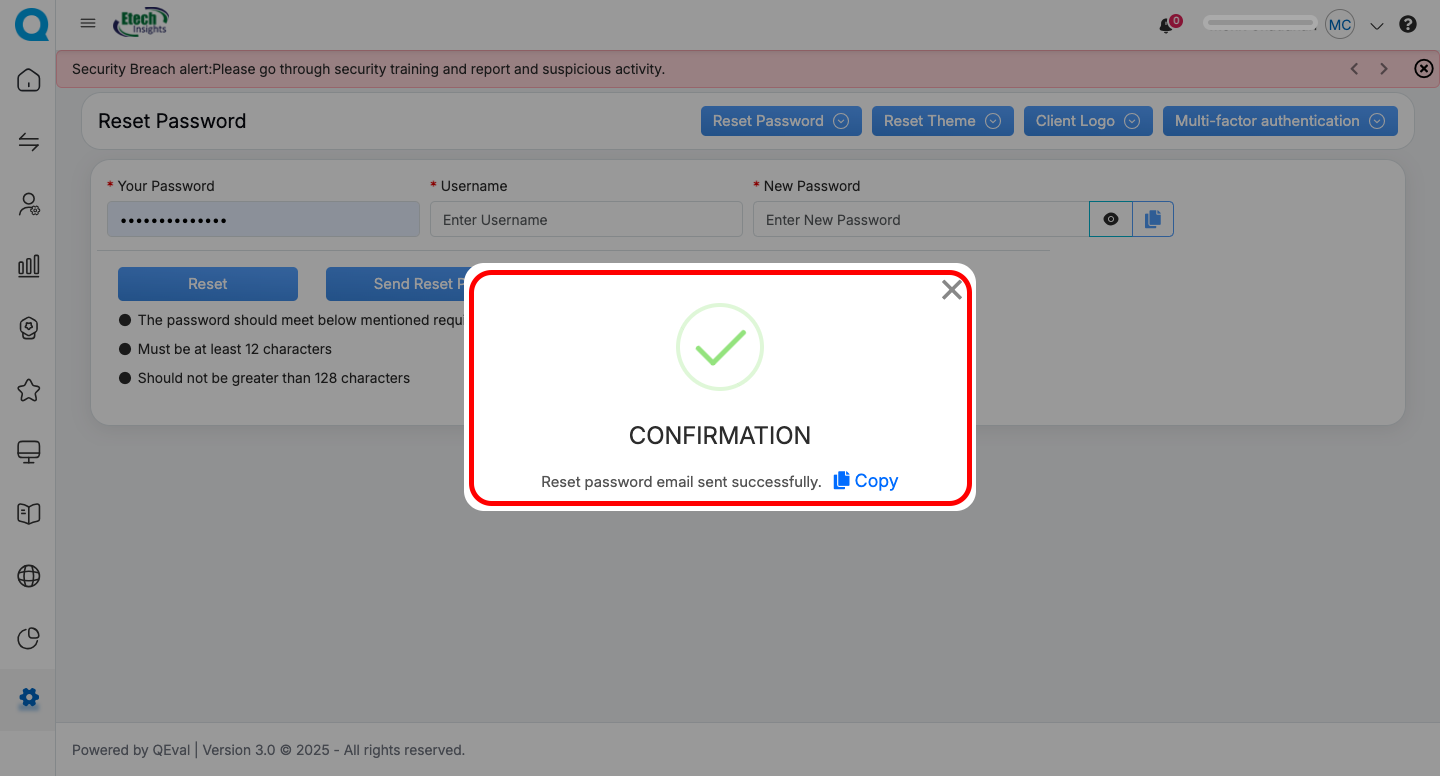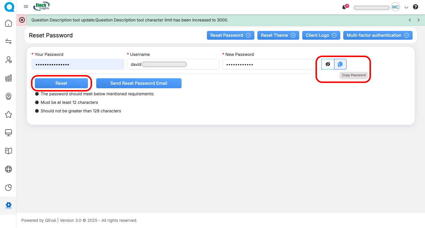 - The admin can also manually reset a user’s password by entering the username, setting a new password, copying it, and clicking the Reset button as shown below. The admin may then share this temporary password with the user, who can log in using it and will be prompted to create a new password on their next login.