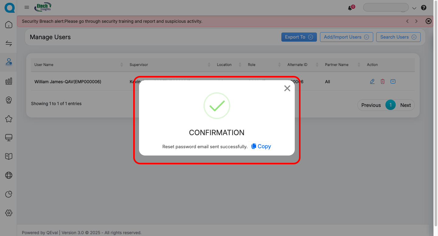 Click on the Send Reset Password Email button as highlighted above — a Password Reset Link will be sent to the user’s registered email address.