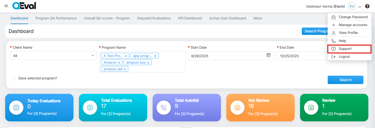 To access this functionality, click on the User Profile dropdown displayed in the top right corner of the screen and select the Support option as highlighted on the following screen: