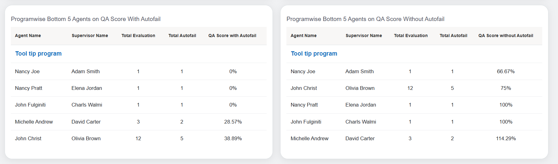 These statistics are displayed in Tabular format. The following table displays the statistics of both programwise QA scores achieved by the bottom (poor) 5 performing agents with and without the Autofail on a weekly basis.