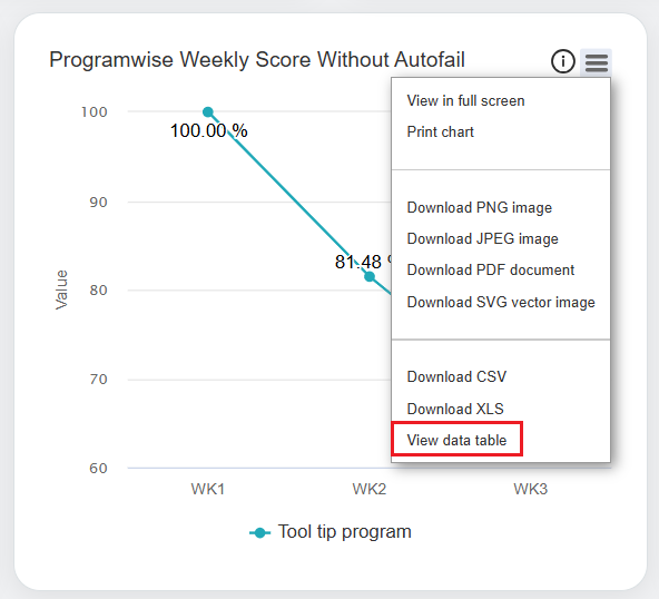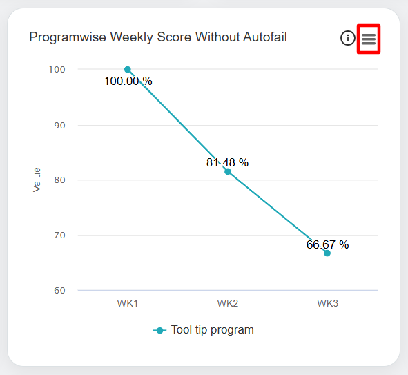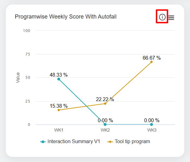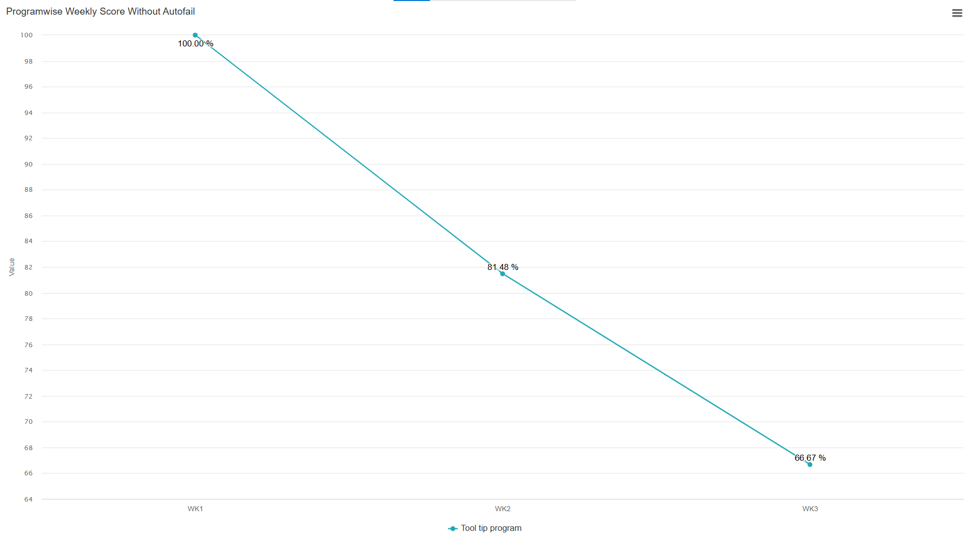 In this window, the date range of each week will be displayed for which the data is displayed for the Programwise Weekly Score with Autofail and Programwise Weekly Score without Autofail in the Line Chart format.