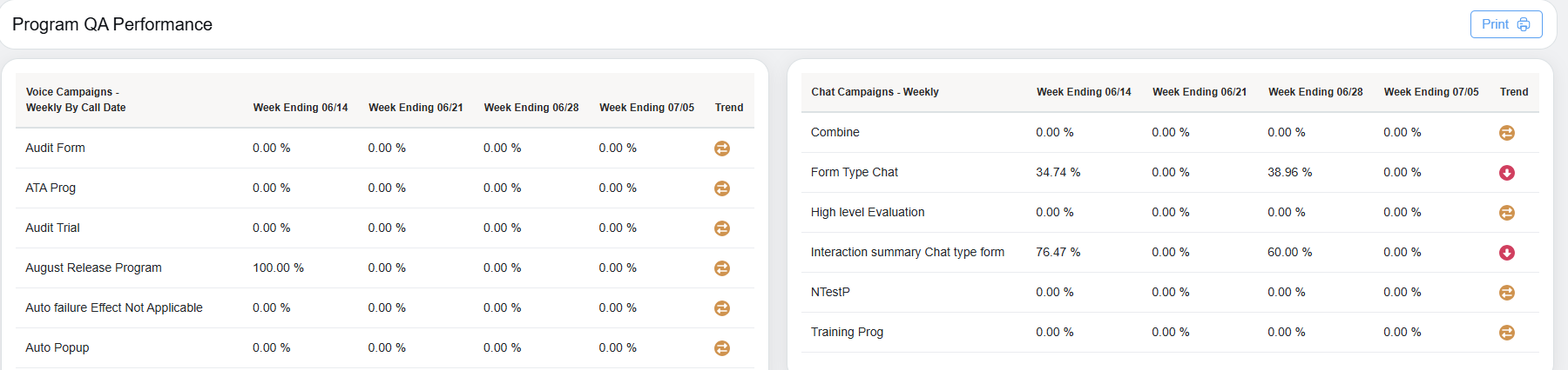 On the Program QA Performance page, the VP would be able to view the weekly data for Voice Campaigns and Chat Campaigns.