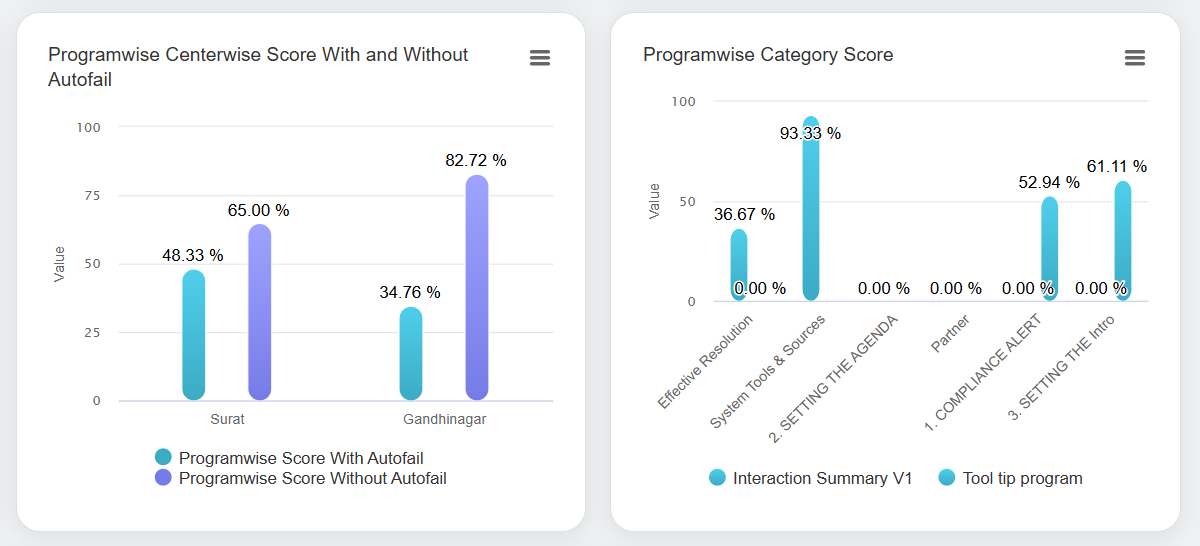These statistics are displayed in the Bar Chart format. The following chart displays the statistics of both programwise scores achieved by the logged-in VP with and without the Autofail on a weekly basis for different centers.