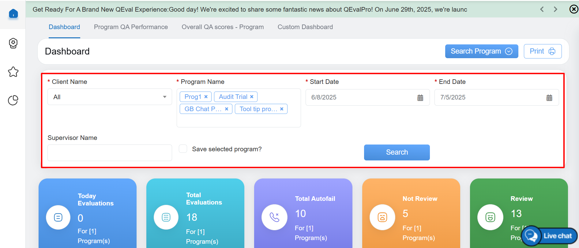The VP will have an option to set the Client Name, Program Name, Start Date, and End Date from the respective date picker options. Select the Save selected program? checkbox for the system to save the particular selected program every time the VP searches any statistic. Once the duration is set, click on the Search button.