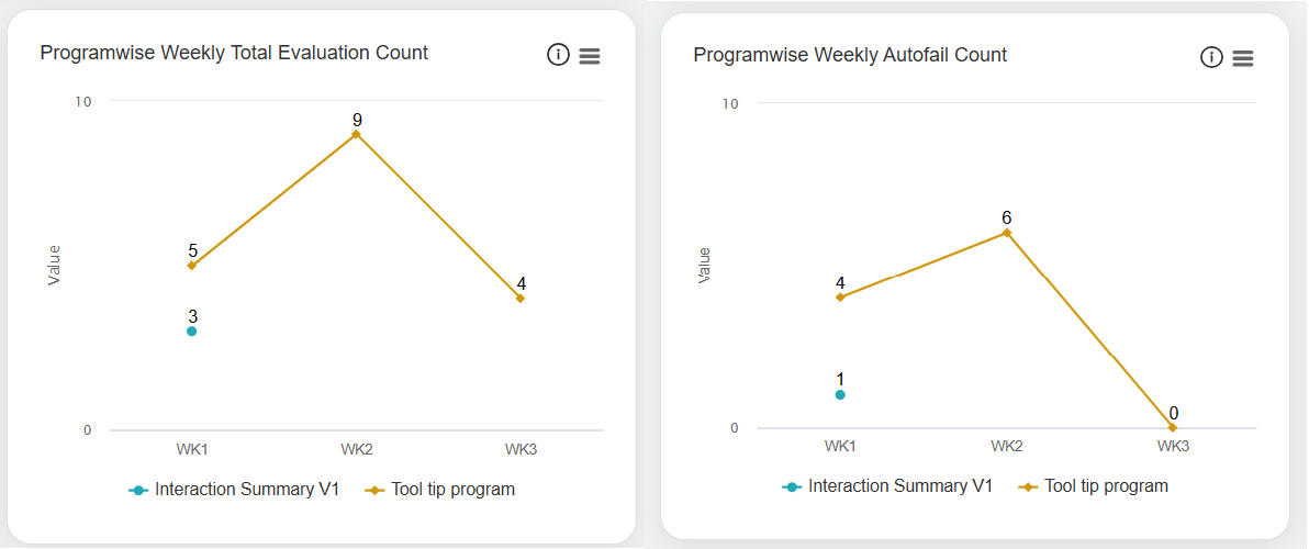 In this window, the date range of each week will be displayed for which the data is displayed for the Programwise Weekly Total Evaluation Count and Programwise Weekly Autofail Count in the Line Chart format.