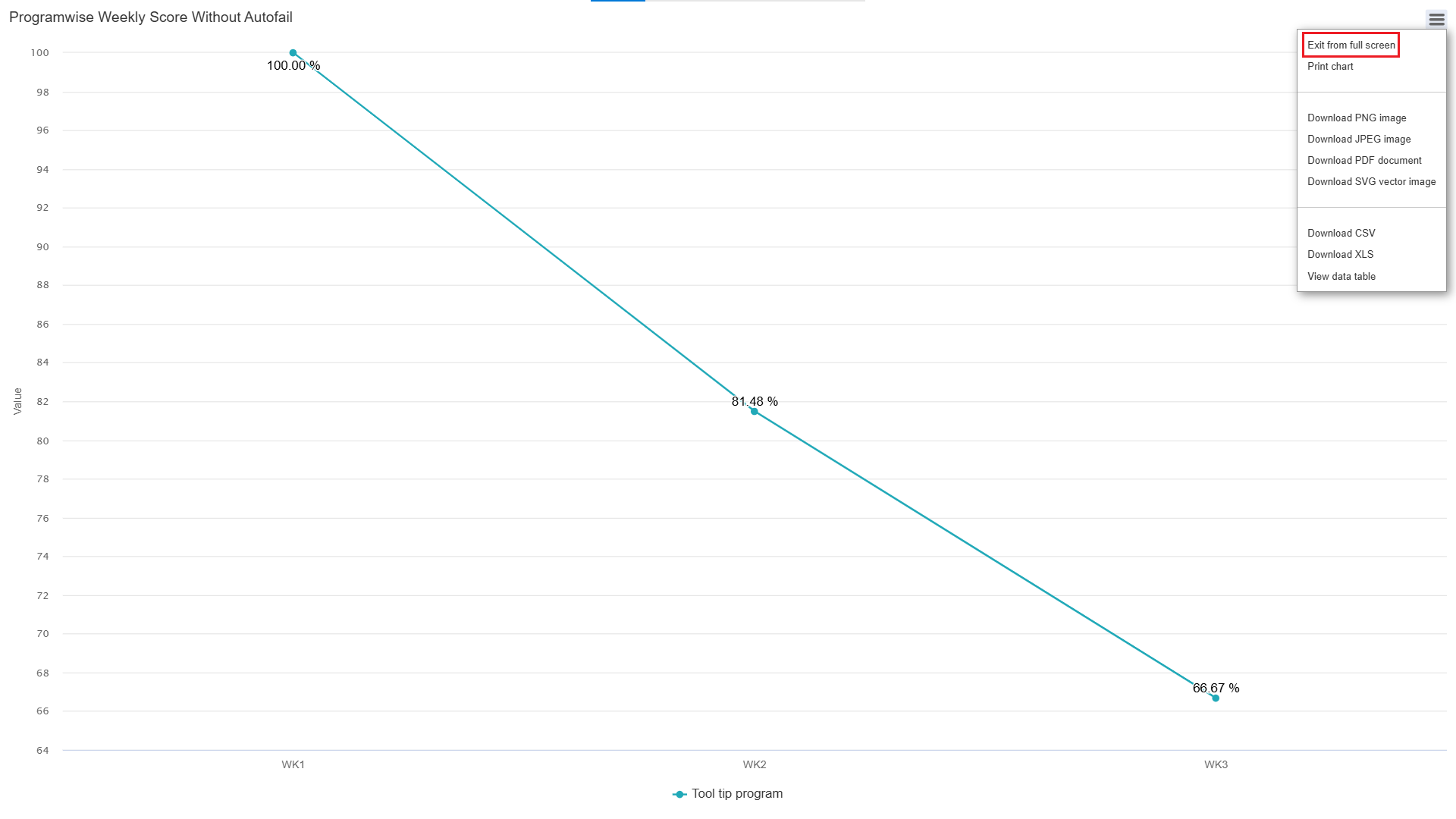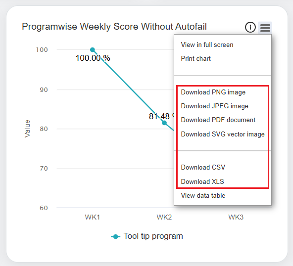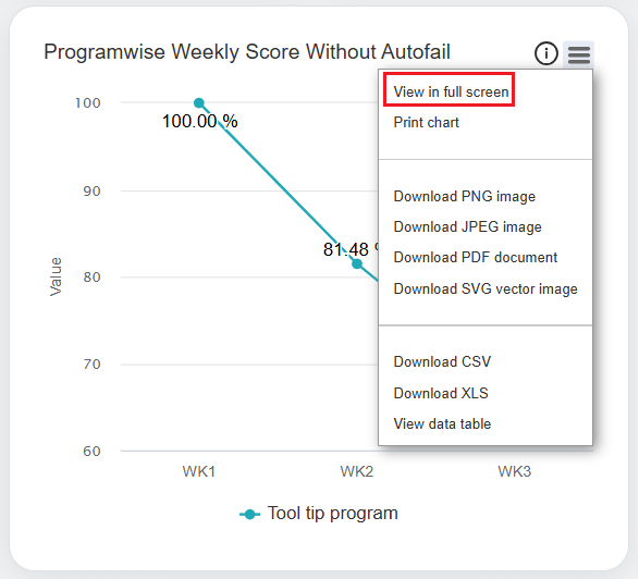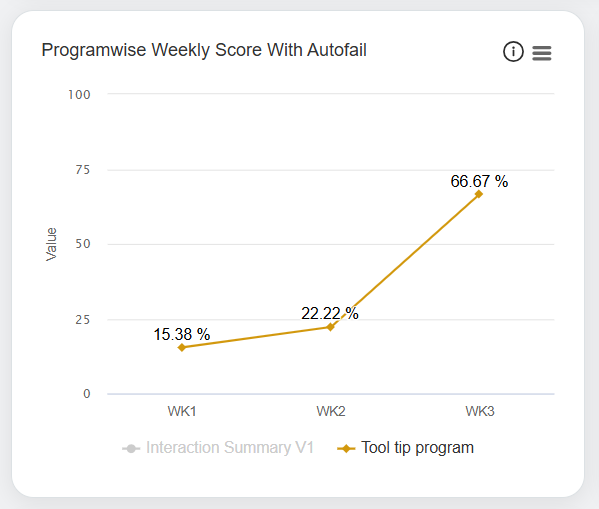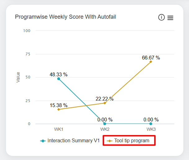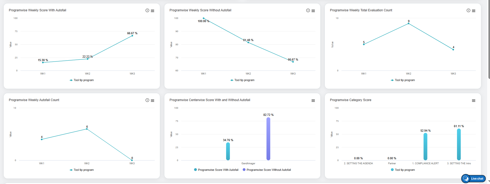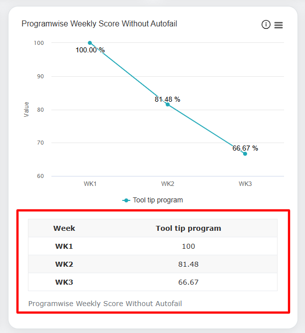 In this window, the date range of each week will be displayed for which the data is displayed for the Programwise Weekly Score with Autofail and Programwise Weekly Score without Autofail in the Line Chart format.