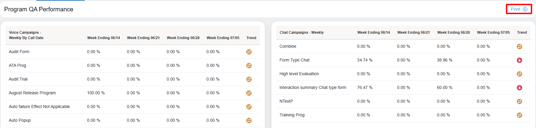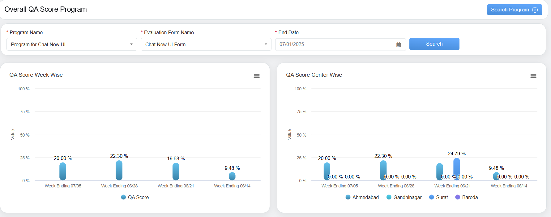 On the Program QA Performance page, the VP would be able to view the weekly data for Voice Campaigns and Chat Campaigns.