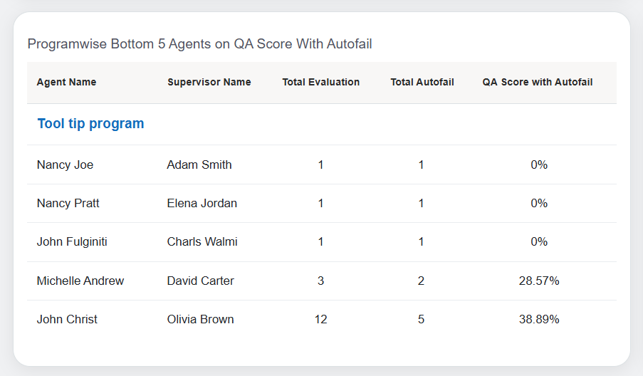 These statistics are displayed in Tabular format. The following table displays the statistics of both programwise QA scores achieved by the bottom (poor) 5 performing agents with and without the Autofail on a weekly basis.