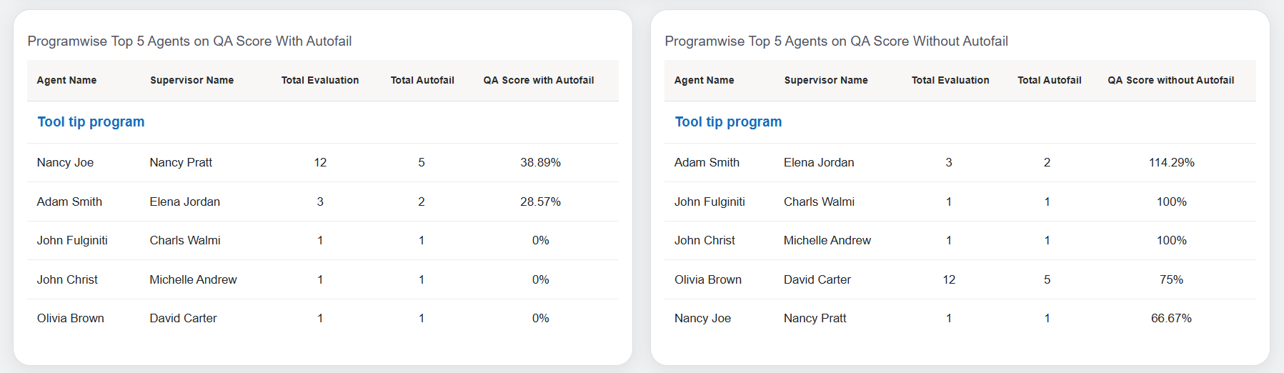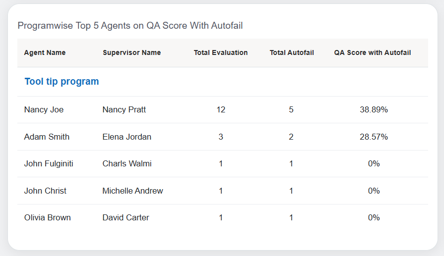 These statistics are displayed in the Table format. The following table displays the statistics of both programwise QA scores achieved by the top 5 performing agents with and without the Autofail on a weekly basis.